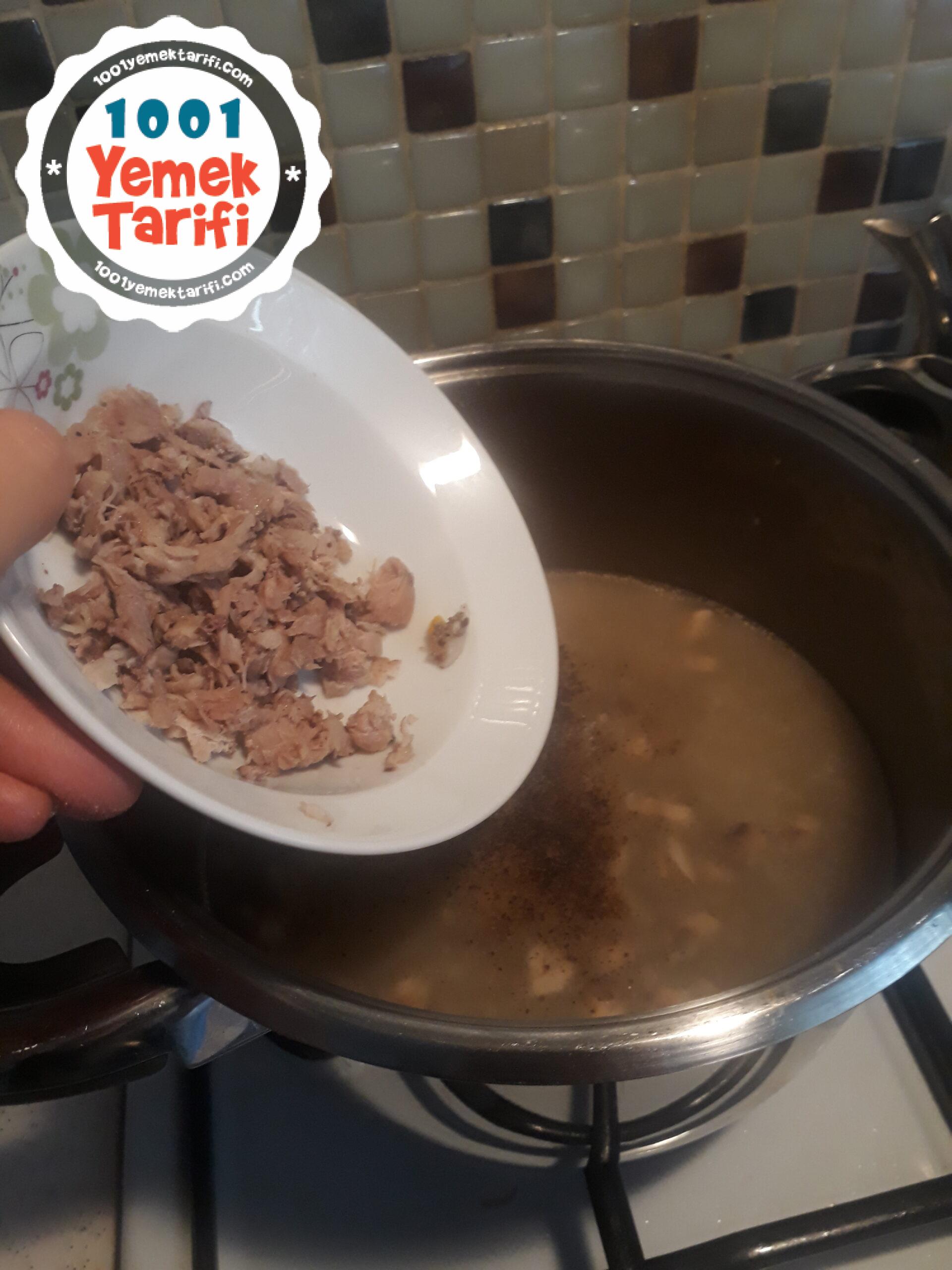 - Sonra haşlanmış tavuğu ilave edip karıştırın.