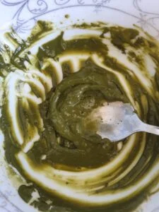 - Machta tozuna 1 kaşık süt ekleyip homojen bir kıvam alana kadar karıştırın.