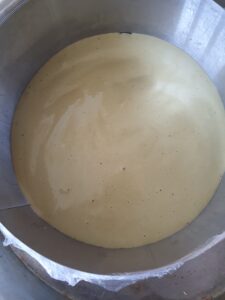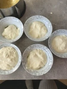 - 5. tabaktan başlayıp tek tek kekin ortasına dökün 1. tabağa kadar.