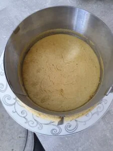 - Soğuyan keki kalıptan çıkarın. Kekin üzerine 18 cm’lik kek kalıbı yerleştirip keki kesin. Keke kelepçeye yerleştirin.