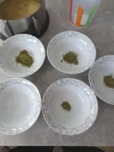 - 5 tane tabak alın. 1. tabağa 4 gr. machta 80 gr. macerpone | 2. tabağa 3 gr. machta 100 gr. macerpone