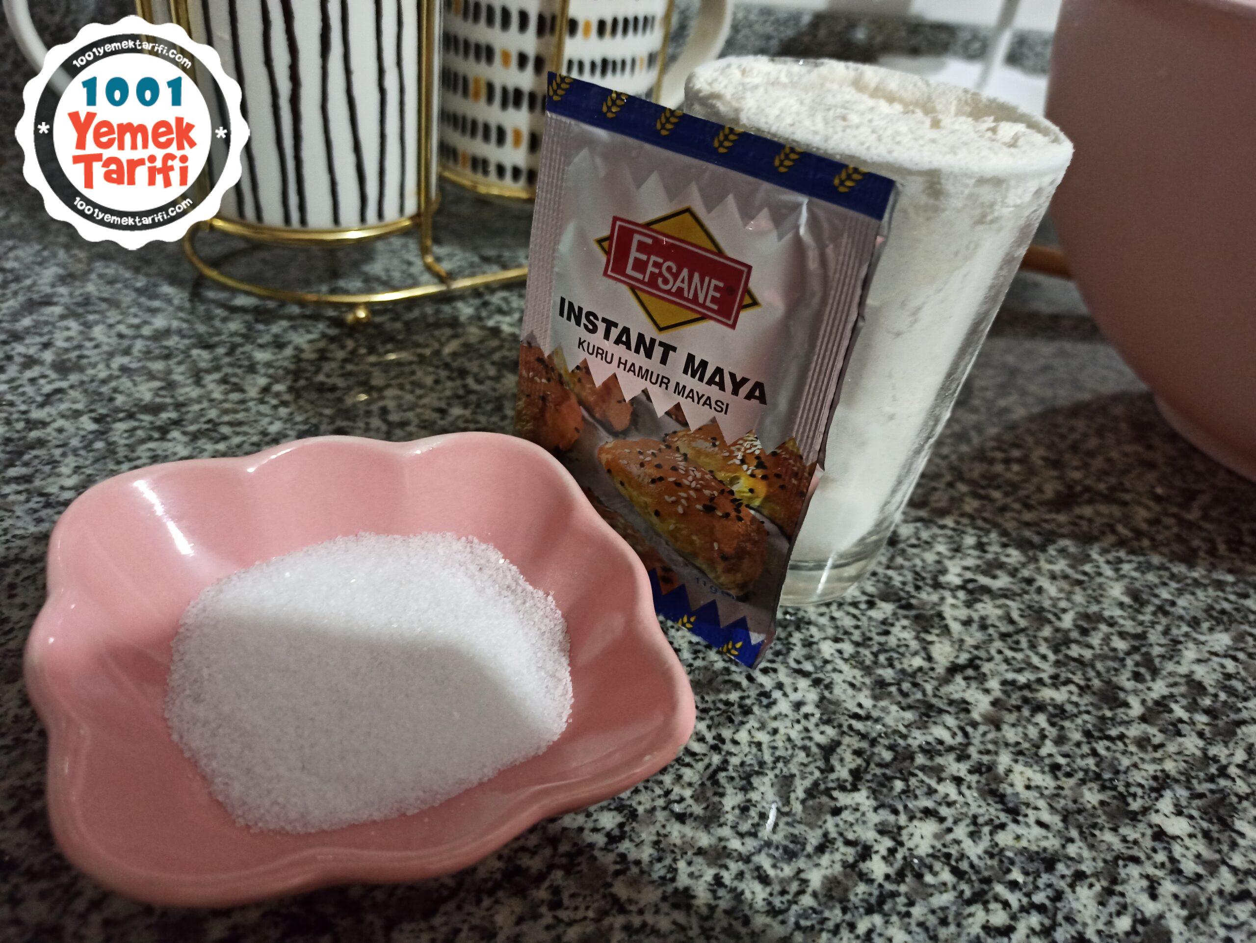 - Öncelikle yoğurma kabımıza bir paket instant kuru maya ve bir bardak ilik suyumuzu alıp mayayı özleştirip kabarmasını sağlıyoruz.