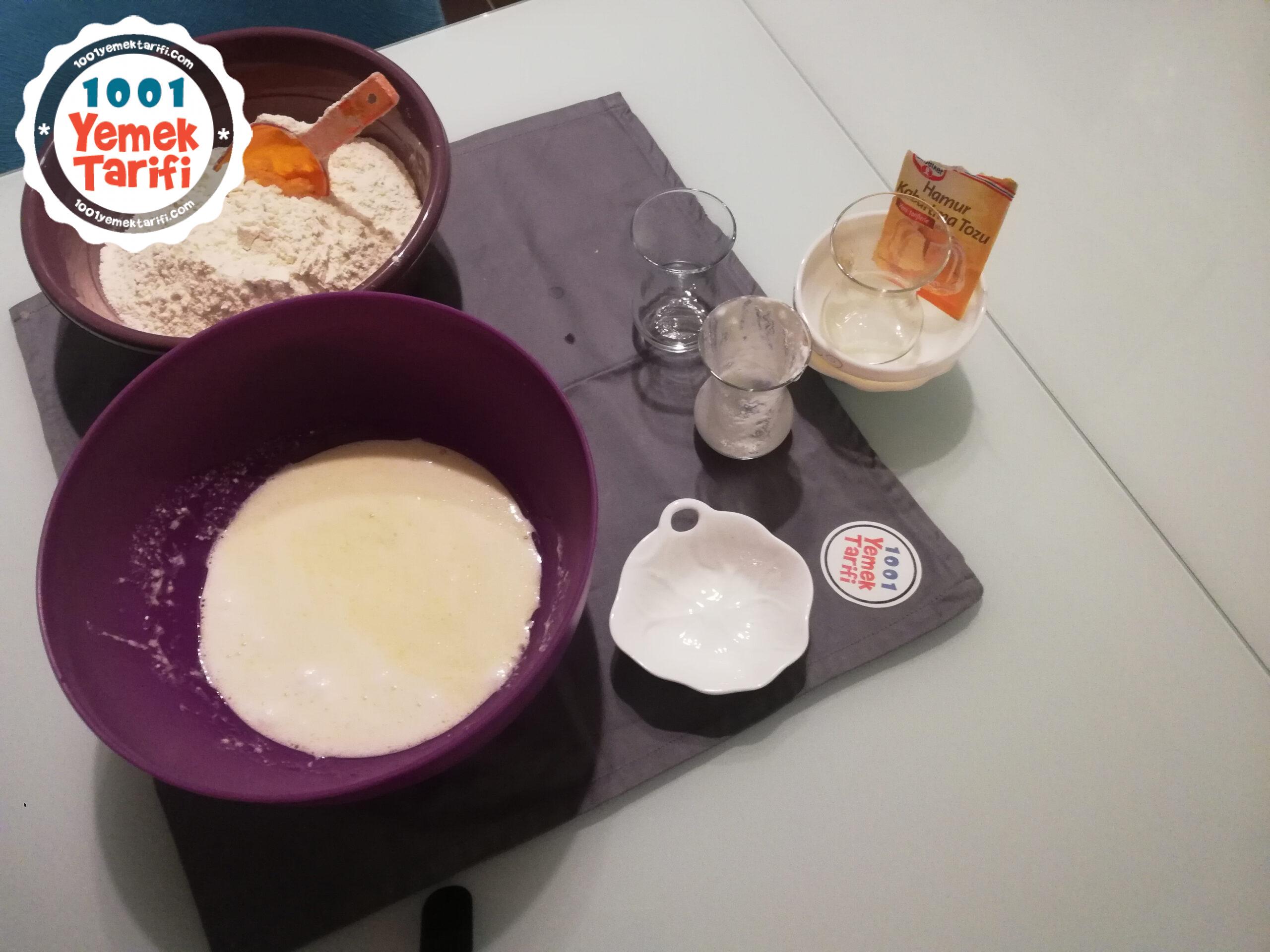 - Yumurta, yoğurt, su, sirke, tuz ve kabartma tozunu yoğurma kabımıza alıp karıştıralım