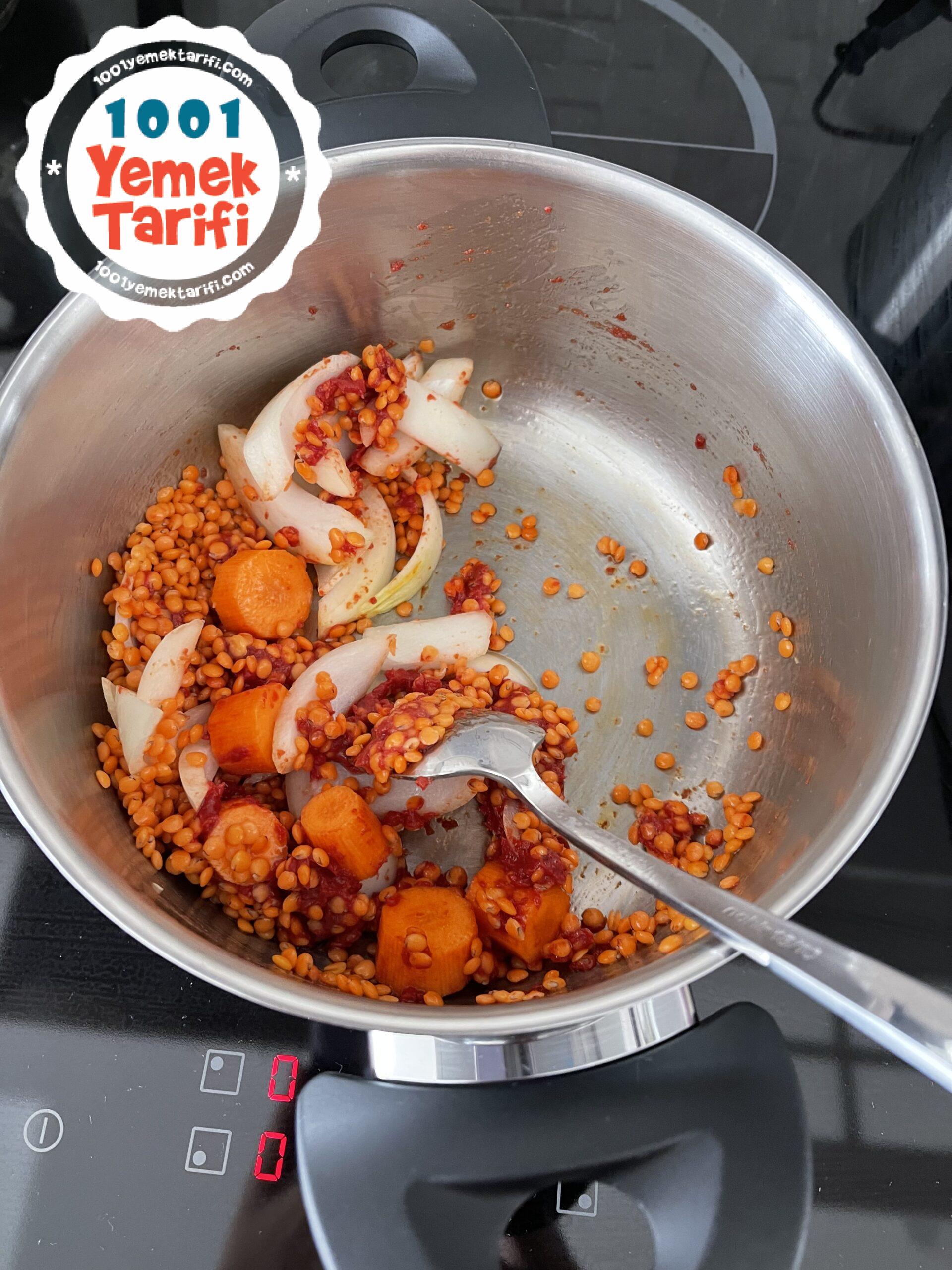 - Bir iki dakika orta ateşte mercimekleri kavurdum. İri iri doğradığımız soğan, havuç, patates ve domatesleri veya salçayı tencereye katıyoruz.
