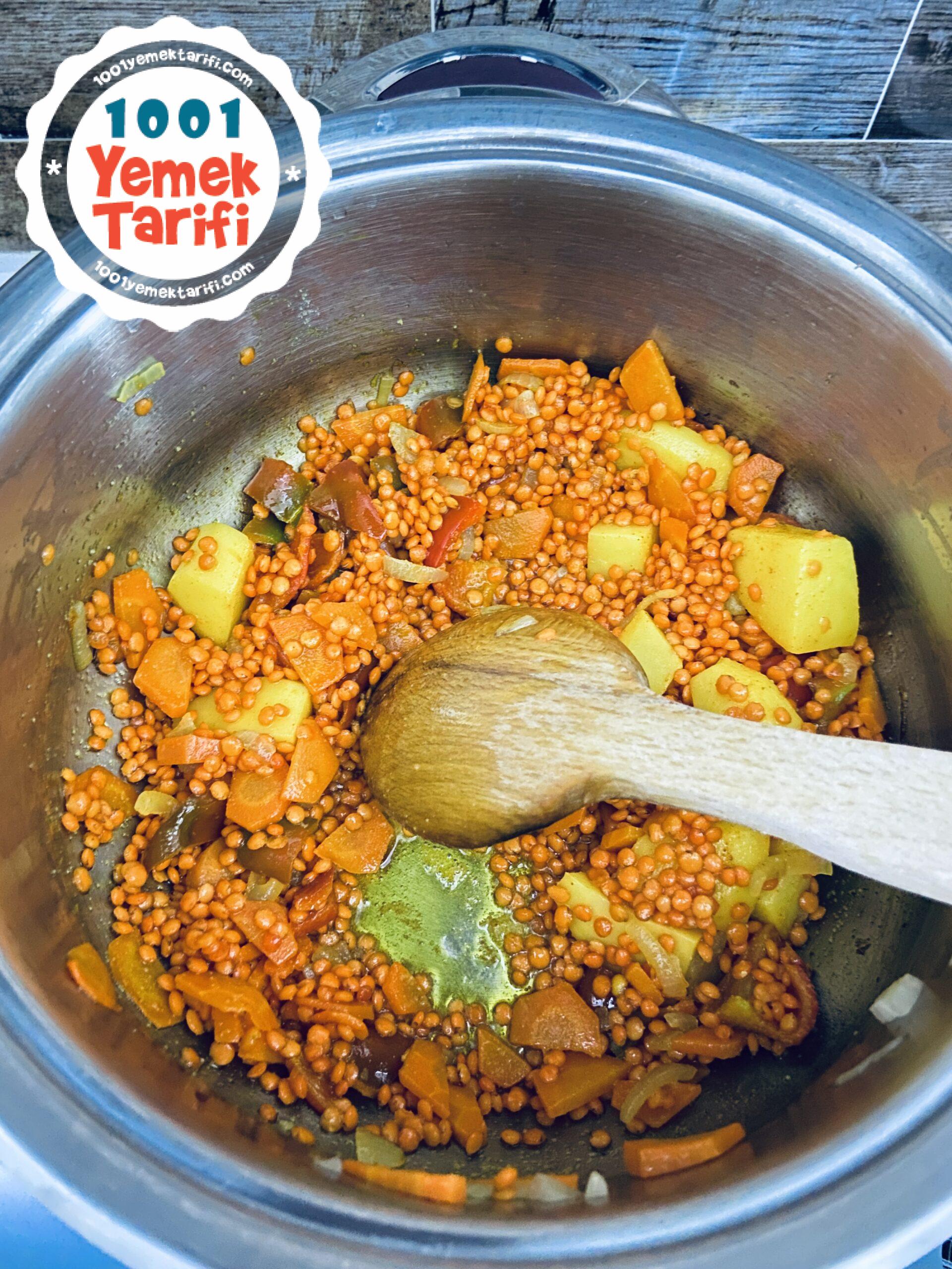 • 5 dakikadan fazla kavurup üzerine mercimek ve zerdeçalı da koyup biraz daha kavuruyoruz.