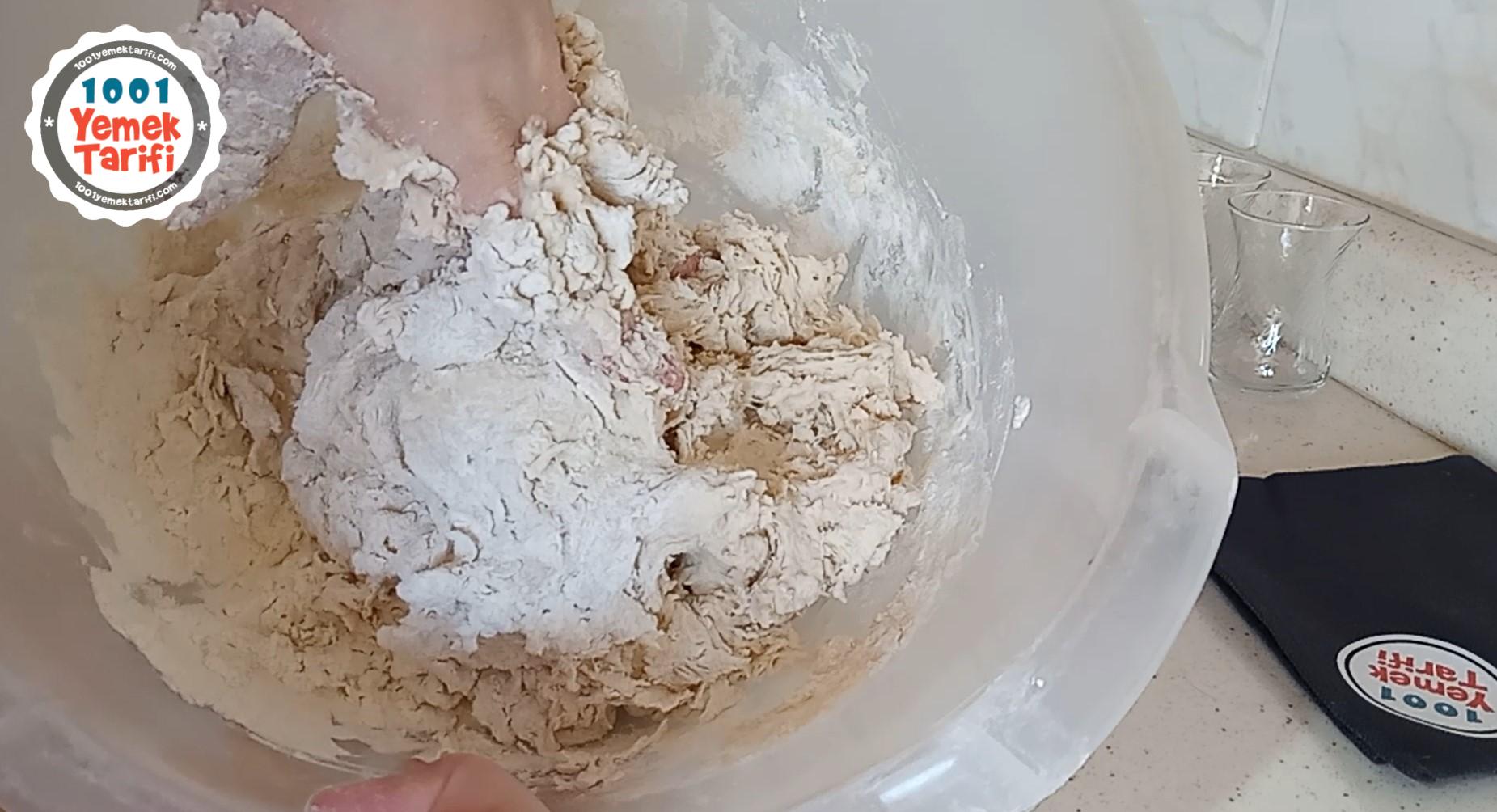- Sonrasında üzerine yavaş yavaş un eklemeye başlıyoruz ve kulak memesi kıvamından biraz daha yumuşak bir hamur elde edene kadar iyice yoğuruyoruz.