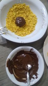 - Kurabiyeleri üzeri çatlayınca kesinlikle kızarmadan fırından çıkaralım. Soğuyunca benmari usulü eritilmiş bir kutu çikolataya tek tek çatal yardımı ile bulayıp ezilmiş mısır gevreğine karıştıralım. Sonra servis tabağına alalım ve serin bir yerde bekletelim…