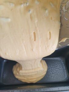 - Bu kek karışımı iki karışımdan oluşuyor biri sade diğeri süt ve kakaodan. Sade olanı önce kalıba dökülüyor üzerini kakaolu karışım eklenip çatalla alttan üste hafif şekiller veriliyor.