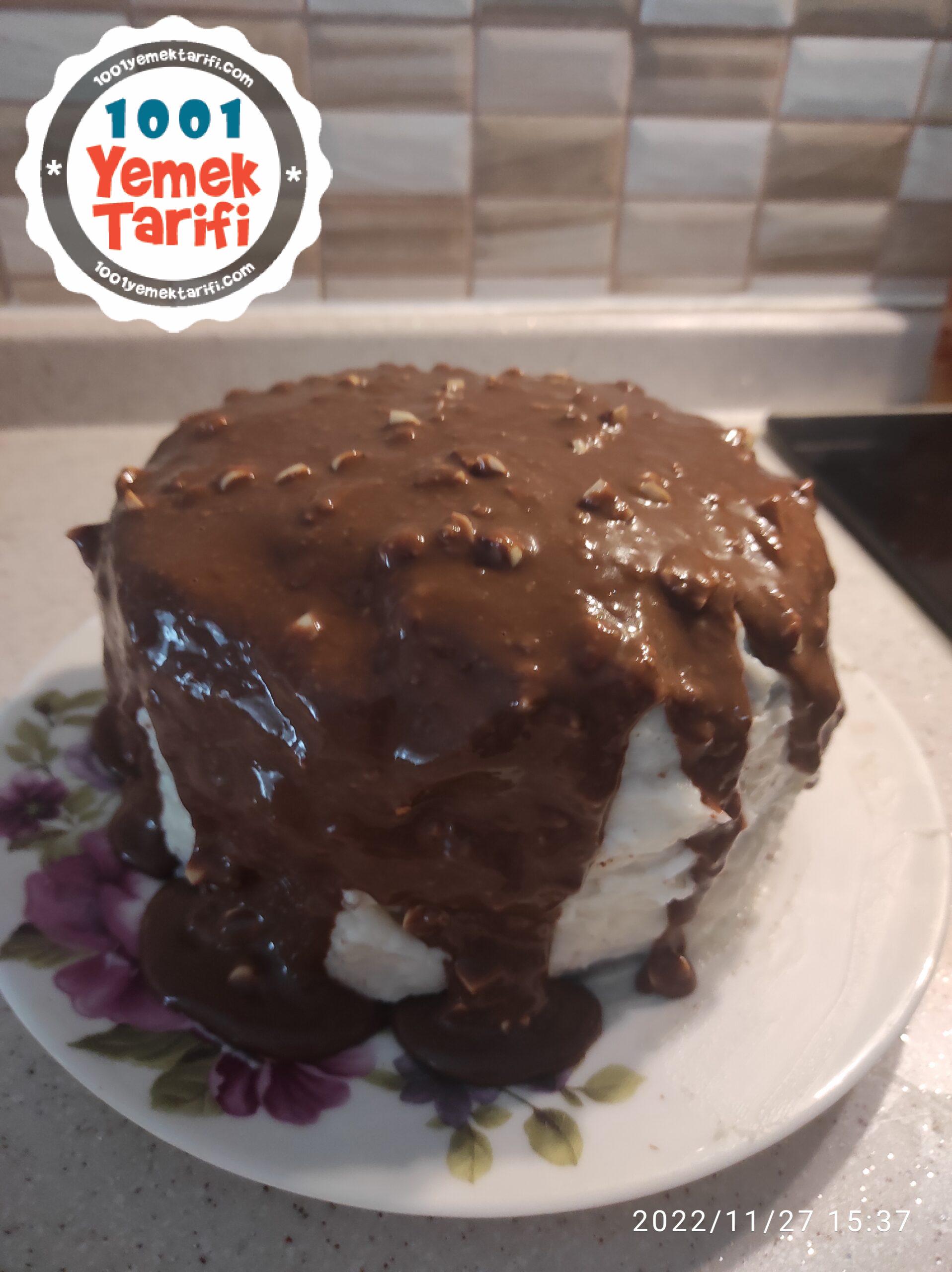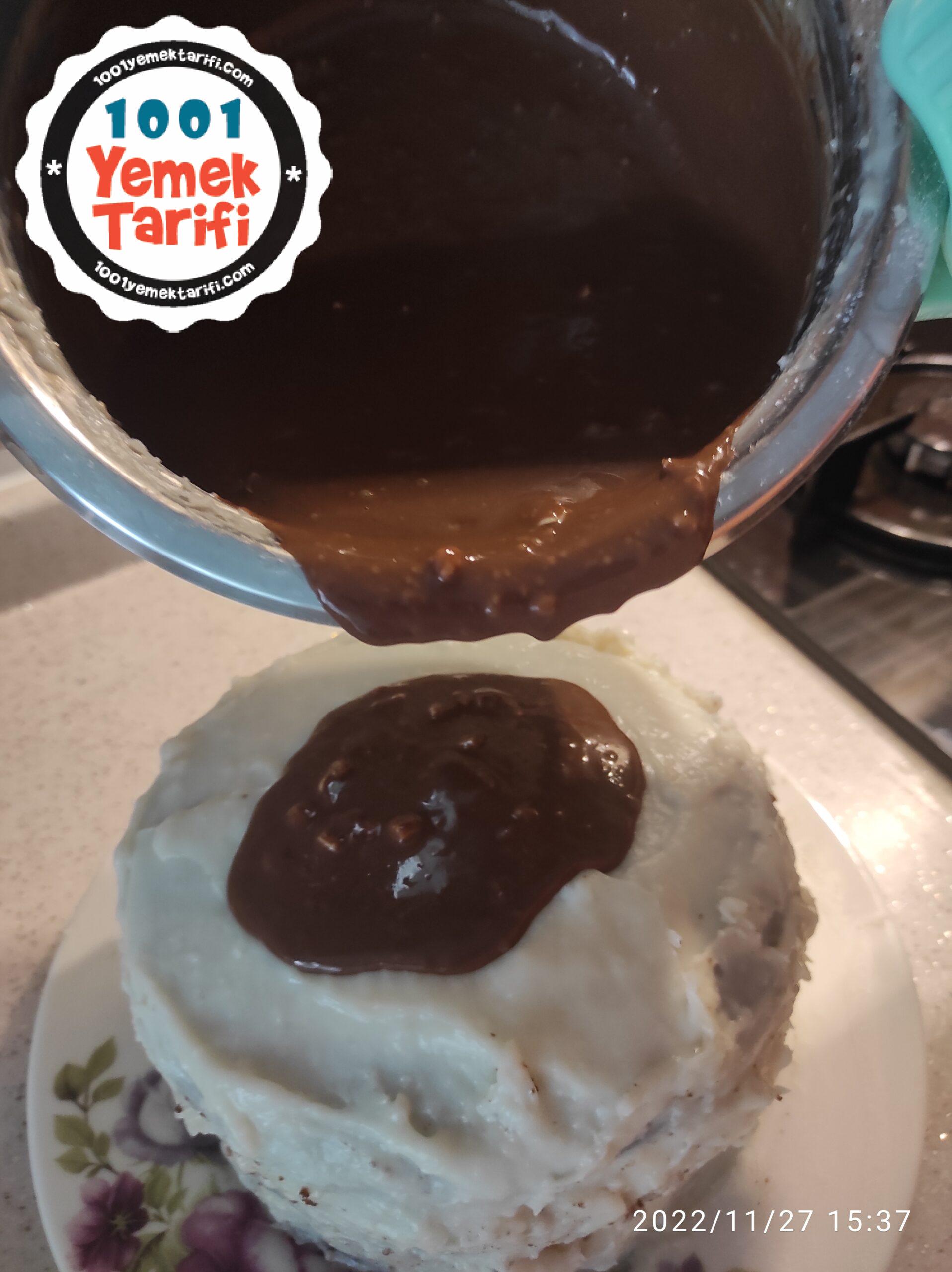 • Yer fistiklarini ekleyip ilk sıcağı çikinca pastanın üzerine dökelim dolapta bekletip servis yapabiliriz.