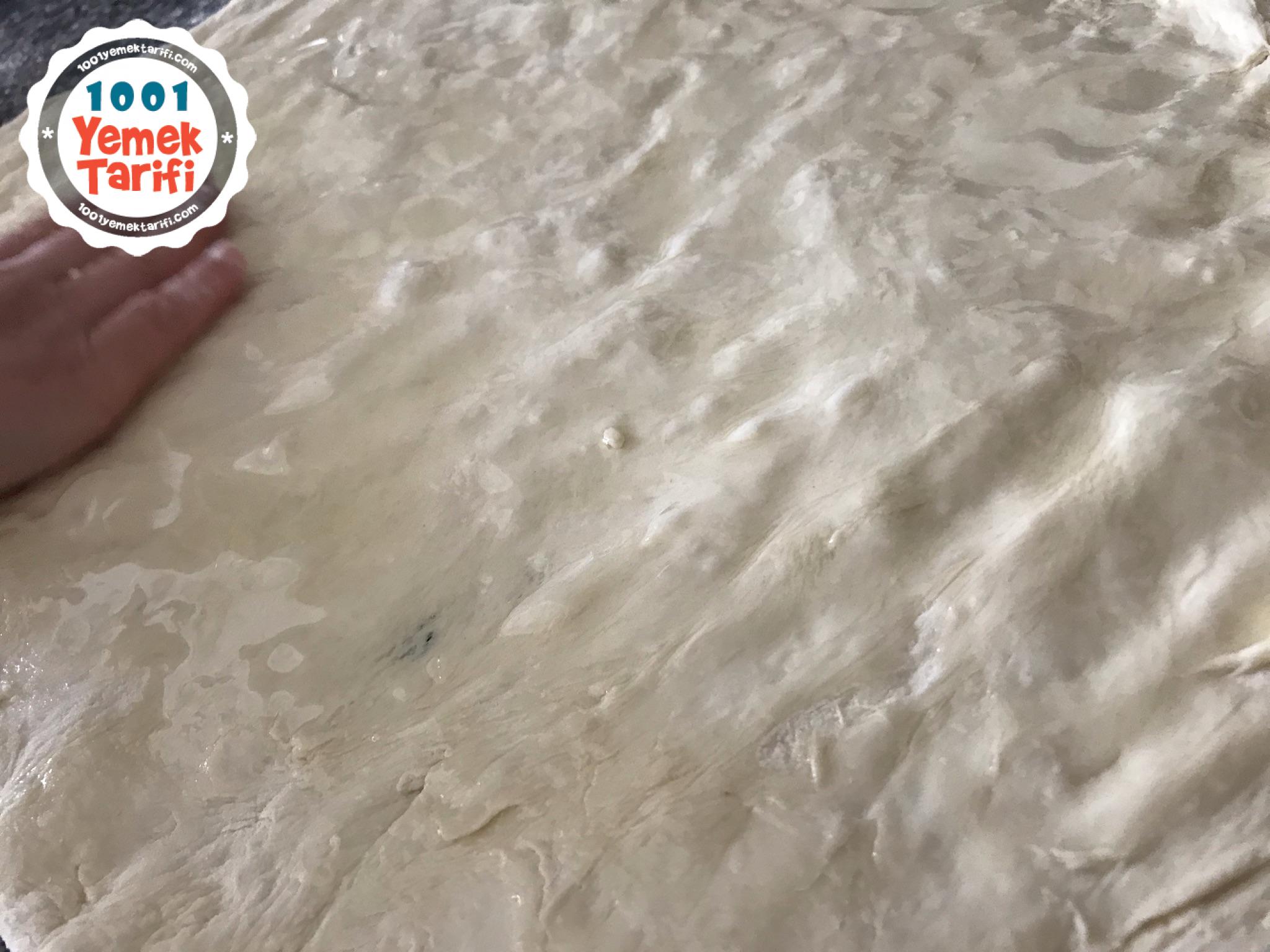 - Mayalanan hamuru tezgahımıza alalım. elimizle hafif büyütelim hamuru daha sonra üzerine biraz yağ dökelim ve yağla açmaya devam edelim