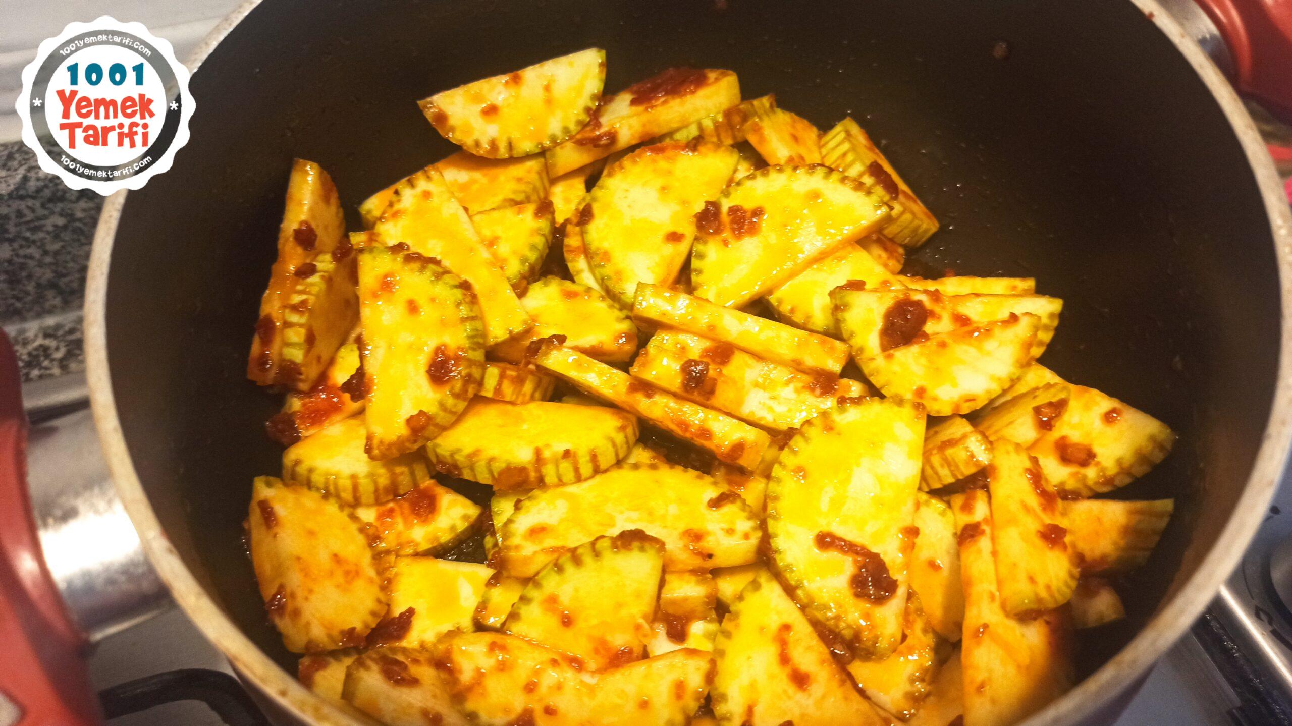 - Dilimlediğimiz kabakları ilave edip 5 dakika kadar kavuralım.