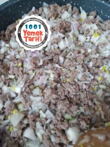 - Bu esnada iç harcı yapmaya başlıyoruz. Büyükçe bir tavaya kıymayı alıyoruz ve tane tane olana kadar kendi yağı ve suyunda güzelce kavuruyoruz.