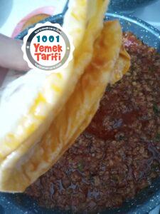 - Lavaşın uç kısmını komple kıymalı karışıma batırıp ıslatıyoruz ve servis tabağına alıyoruz.