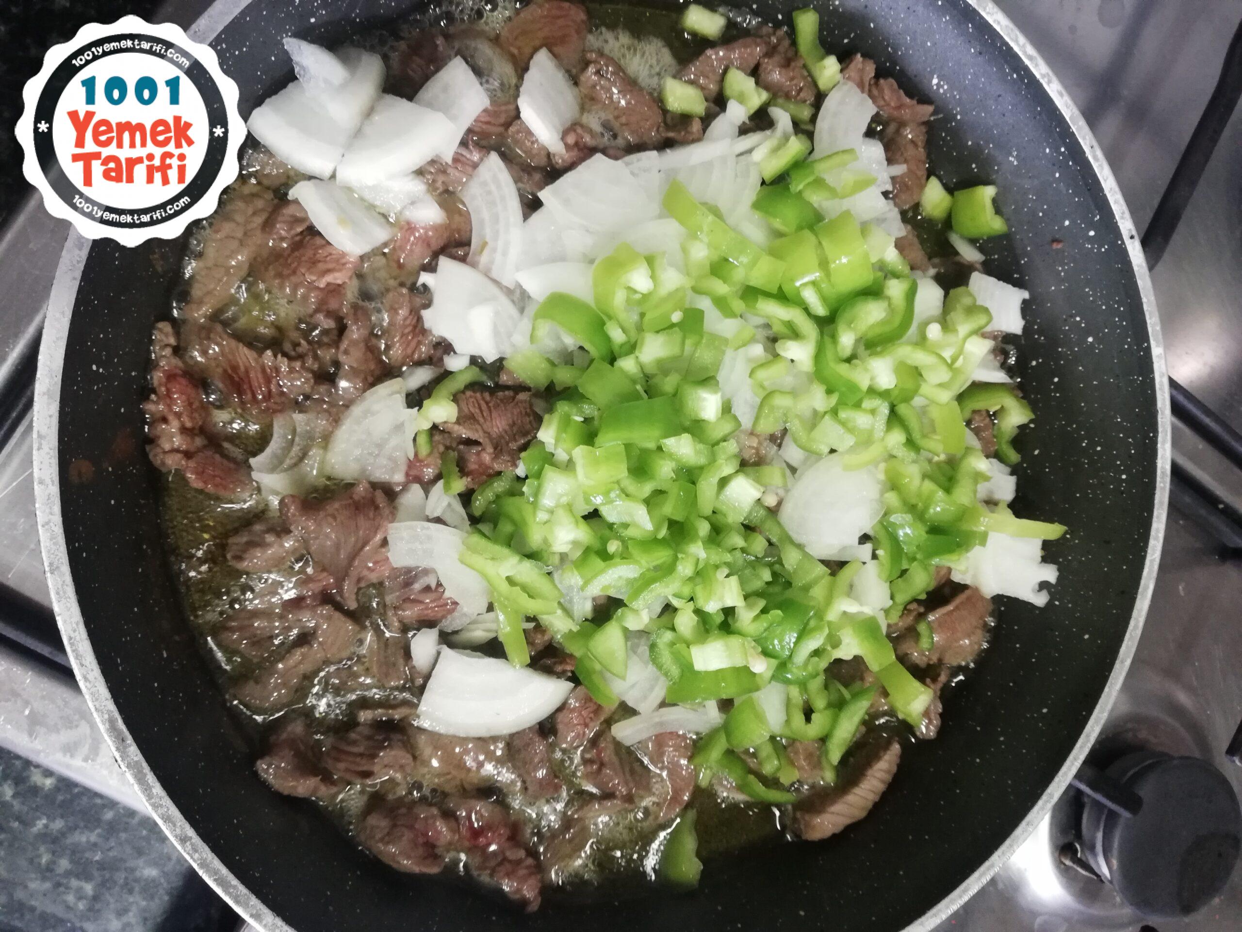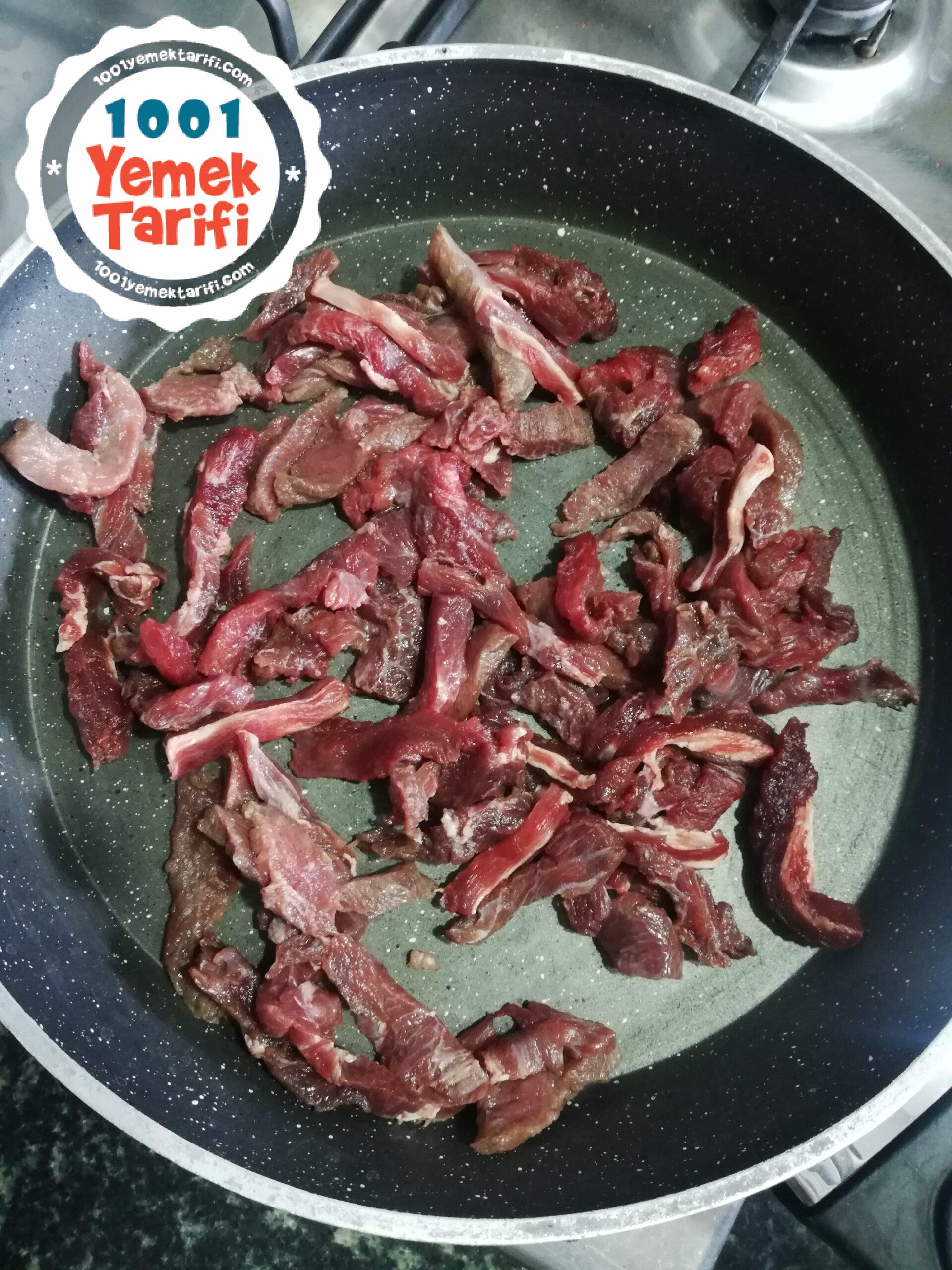 • Etimiz şulyen şeklinde kesiyoruz ve tavamıza koyalım ve suyunu salıp çekene kadar pişirelim.