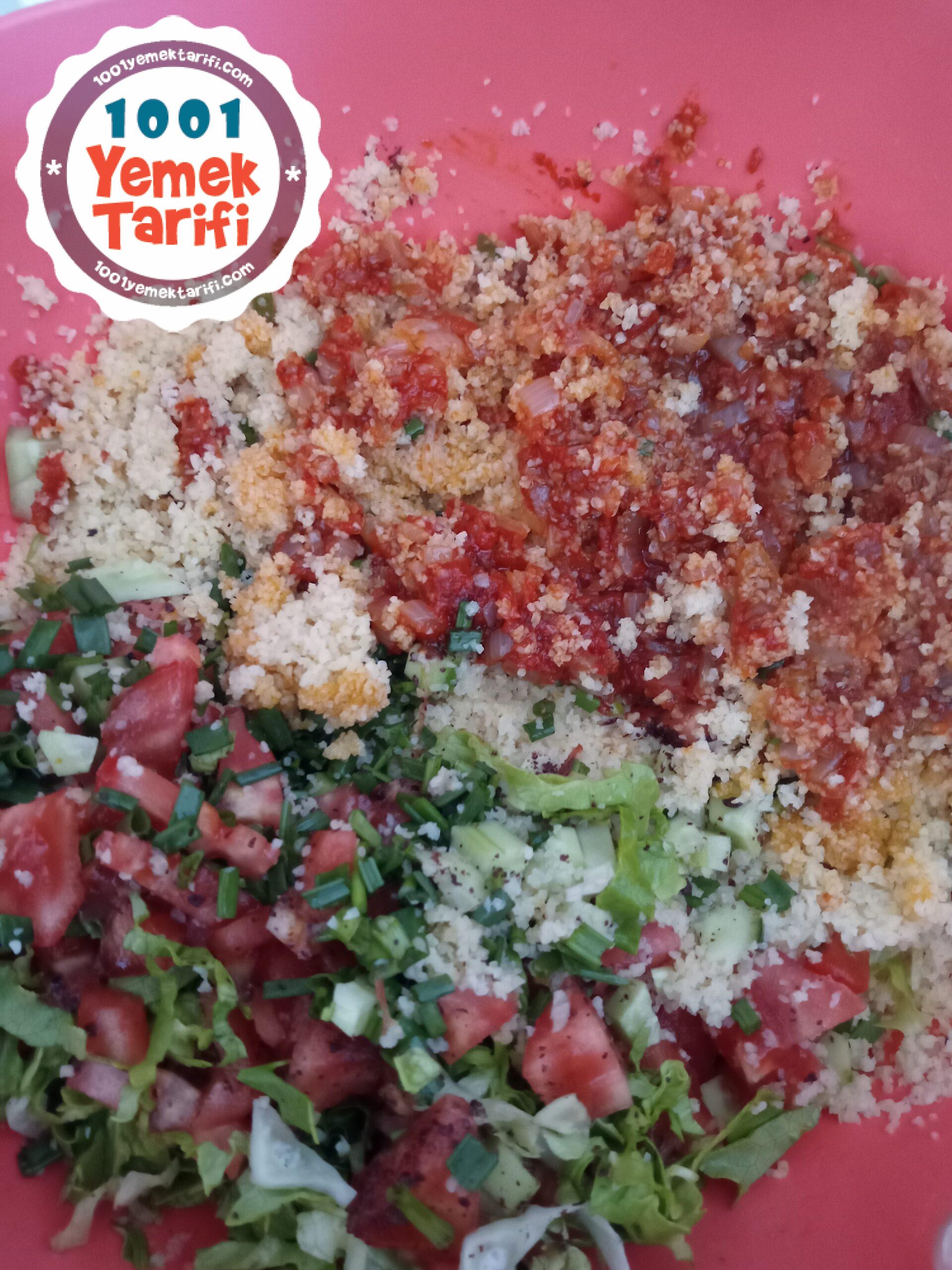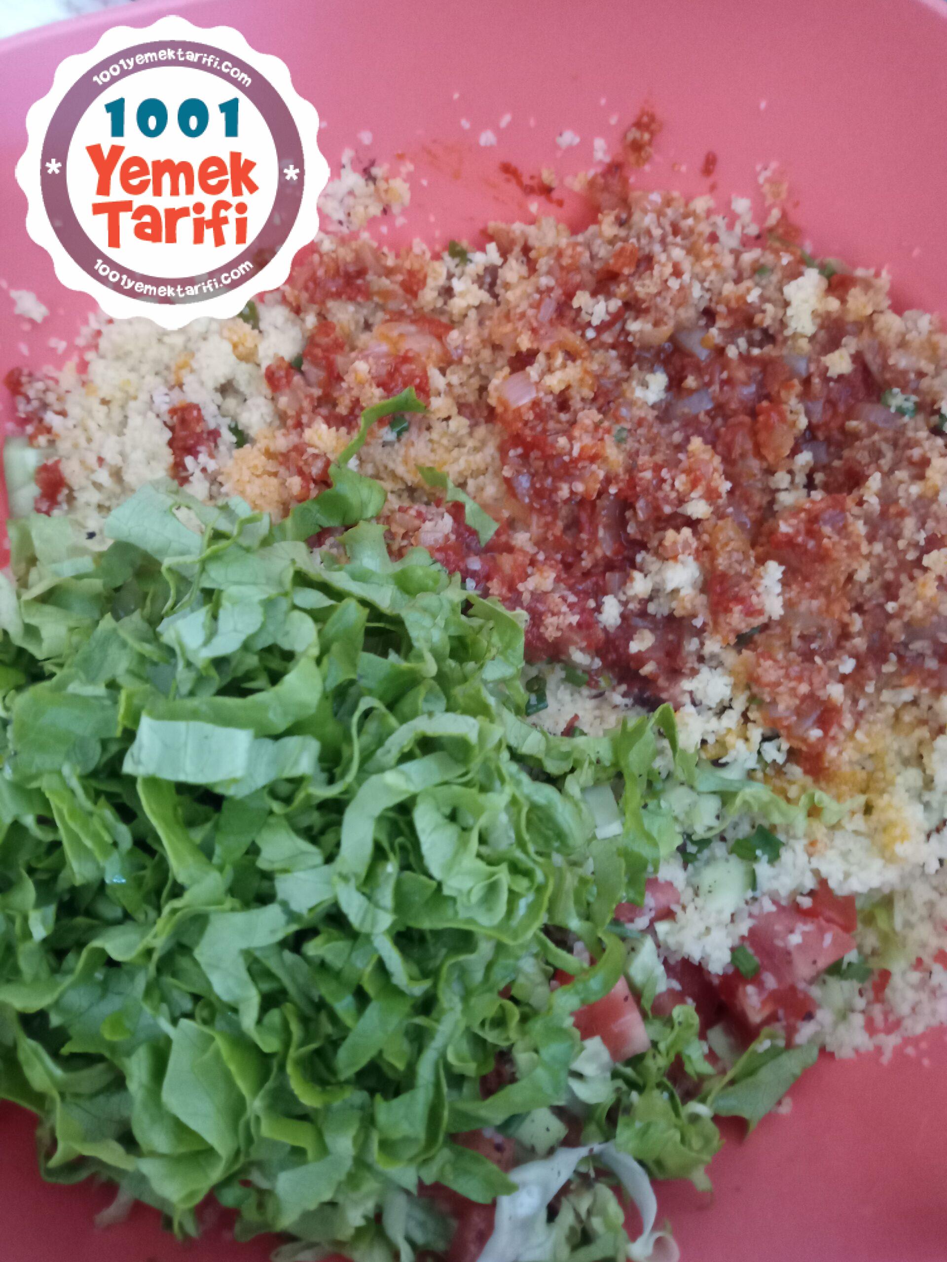 - Tüm yeşillik ve sebzelerimizi ince ince doğrayıp sebzeleri de ince bulgurun üzerine ilave edelim.
