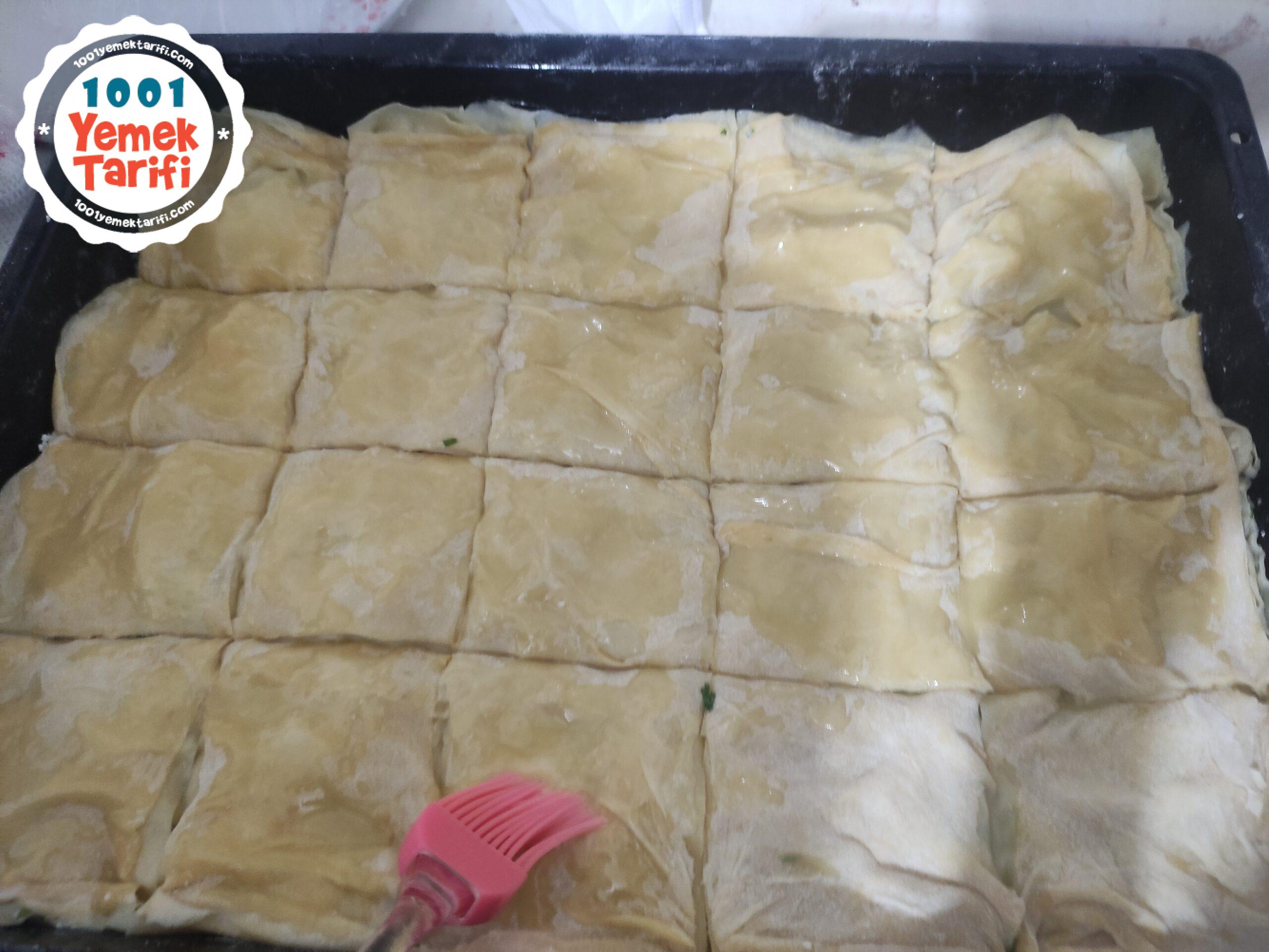 • en üst katı haslamadan tepsiye yerleştirilir üzerine yağ sürülür kesilip 180 derecede pişirilir