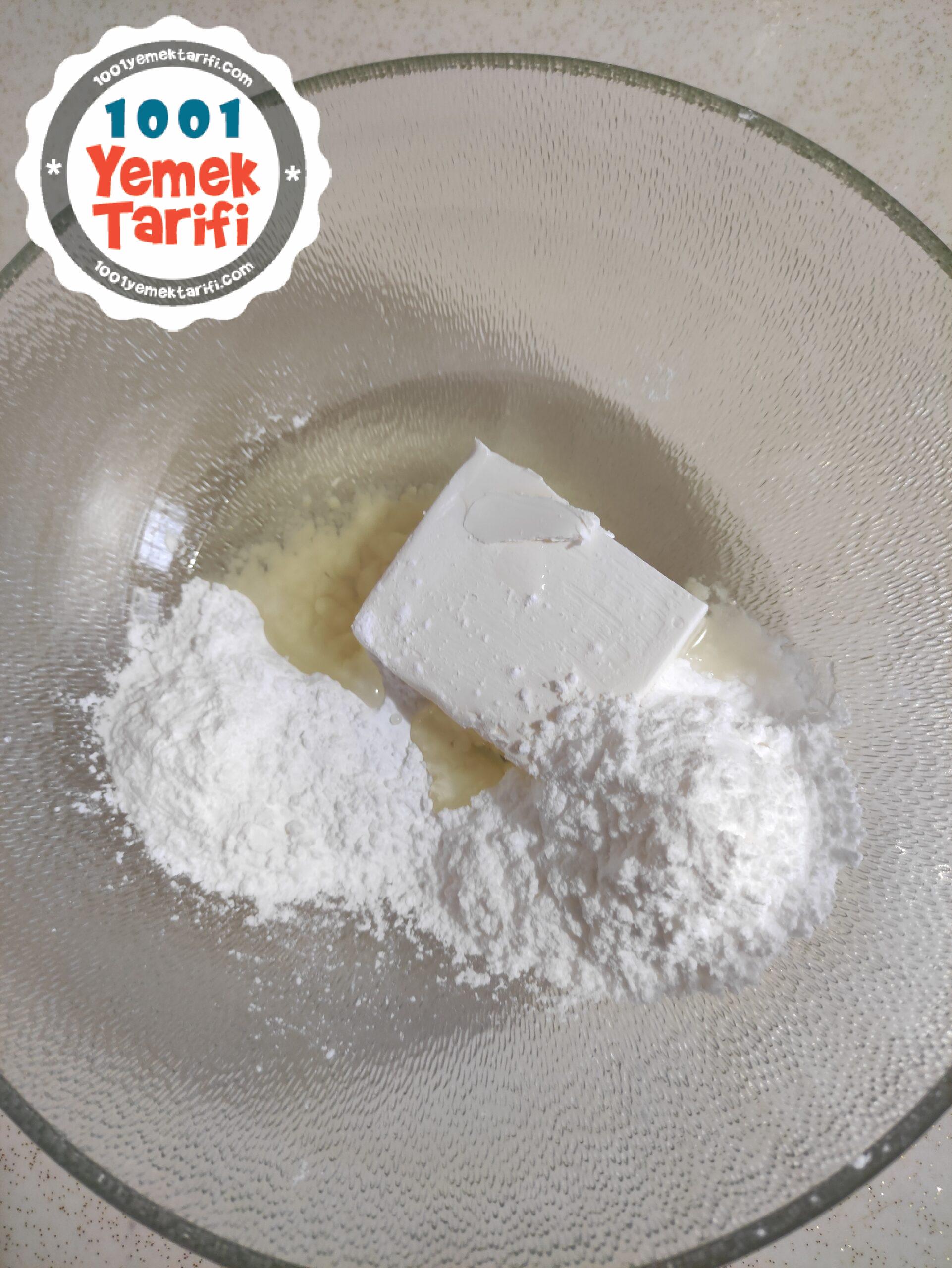 - Yumuşayan margarin pudra şekeri, nişasta ve sıvı yağı yoğurma kabına alalım.