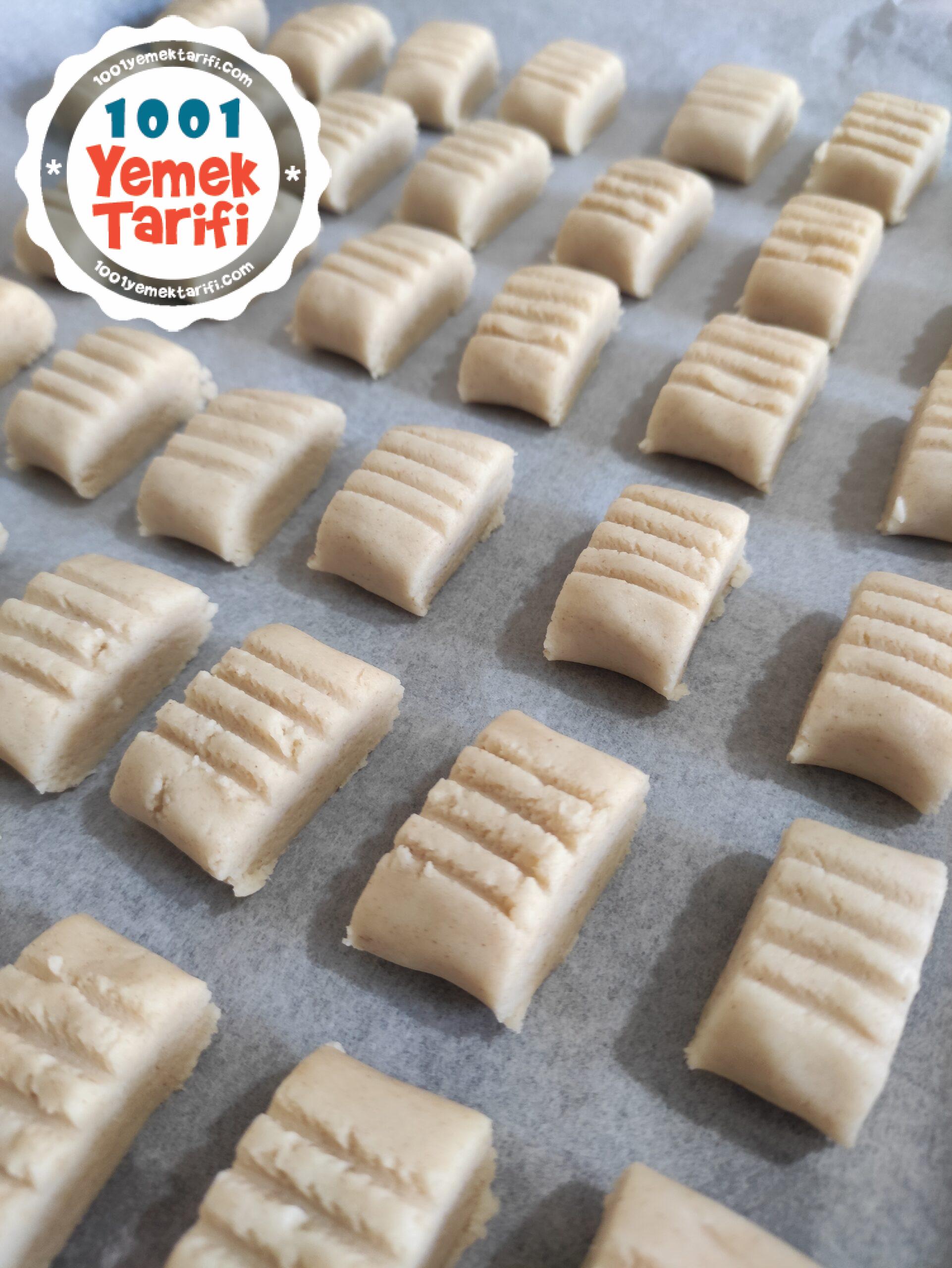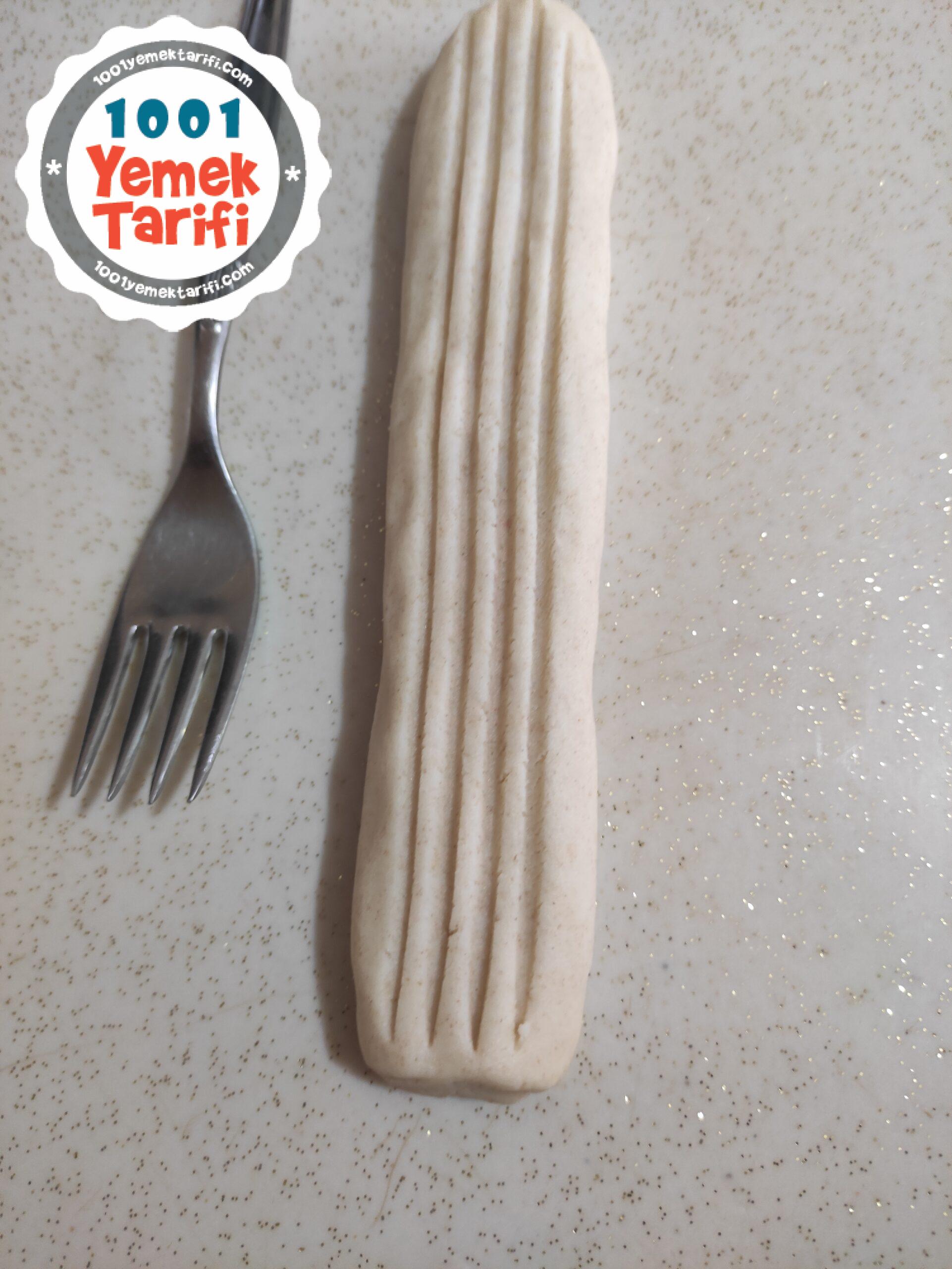 - Ardından şekil vermek için hamurdan parçalar koparıp uzun rulolar yapılır. Çatal ile şekil verilir.