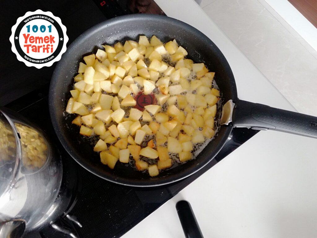 - Tavamıza tereyağı ve sıvıyağı alıp tereyağı eriyince küp küp doğradığımız patateslerimizi kızartalım
