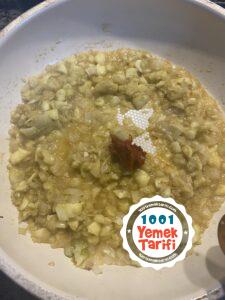 - Ardından salçayı ve baharatları ekleyin. Salça karışana kadar tavada kavurmaya devam edin.
