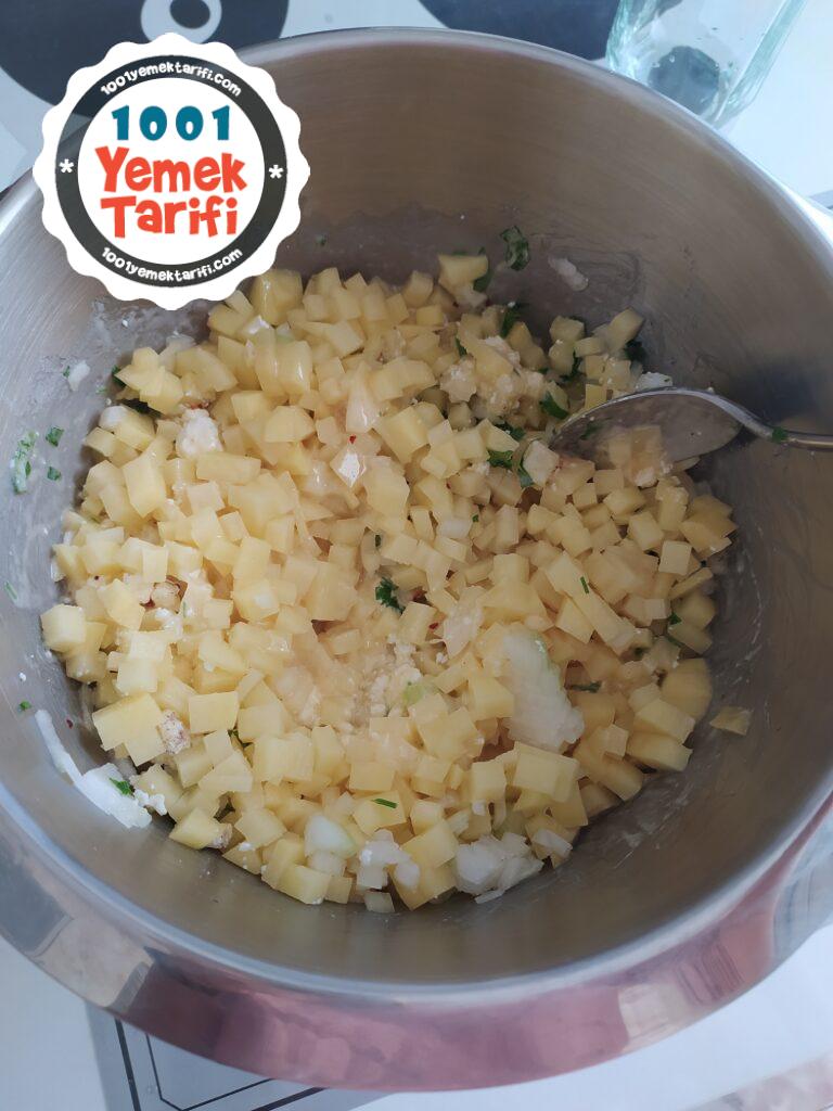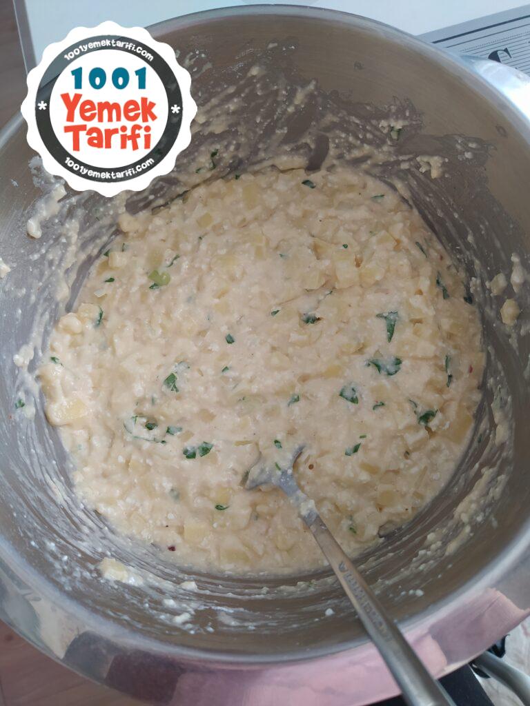 - Doğranmış patates maydanoz ve soğanda eklendikten sonra un ve kabartma tozu ilave edilereK kıvamlı bir karışım elde edilir.