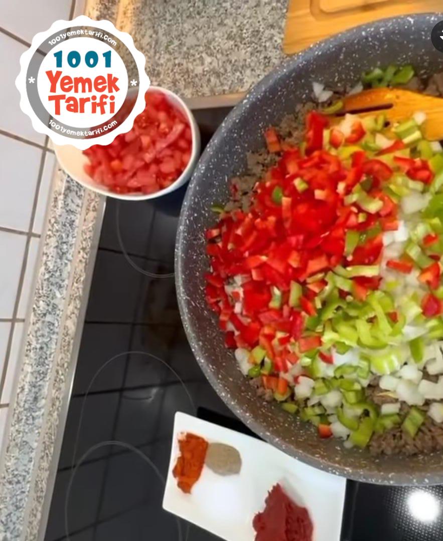 - Suyunu çeken etlere 3-4 yemek kaşığı sıvı yağ, doğramış olduğumuz biberler, kuru soğan ve biber salçasını ilave ederek karıştıralım.