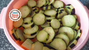 - Patlıcanları yıkadıktan sonra çizgili soyup halka halka doğrayalım.