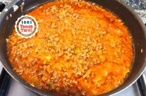 - Diğer tarafta sıvı yağda kıyma, soğan, sarımsak ve baharatları salça ile kavuralım.
