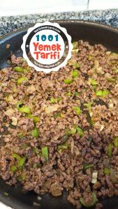 - Diğer tarafta sıvı yağda kıyma, soğan, sarımsak ve baharatları salça ile kavuralım.