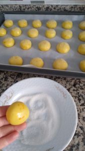 - Üzerlerini yarım kahve fincanı toz şekere batıralım. Yağlı kağıt serilmiş fırın tepsisine dizelim ve 180 derecede önceden ısıtılmış fırında alt üst ayarda pişmeye bırakalım.