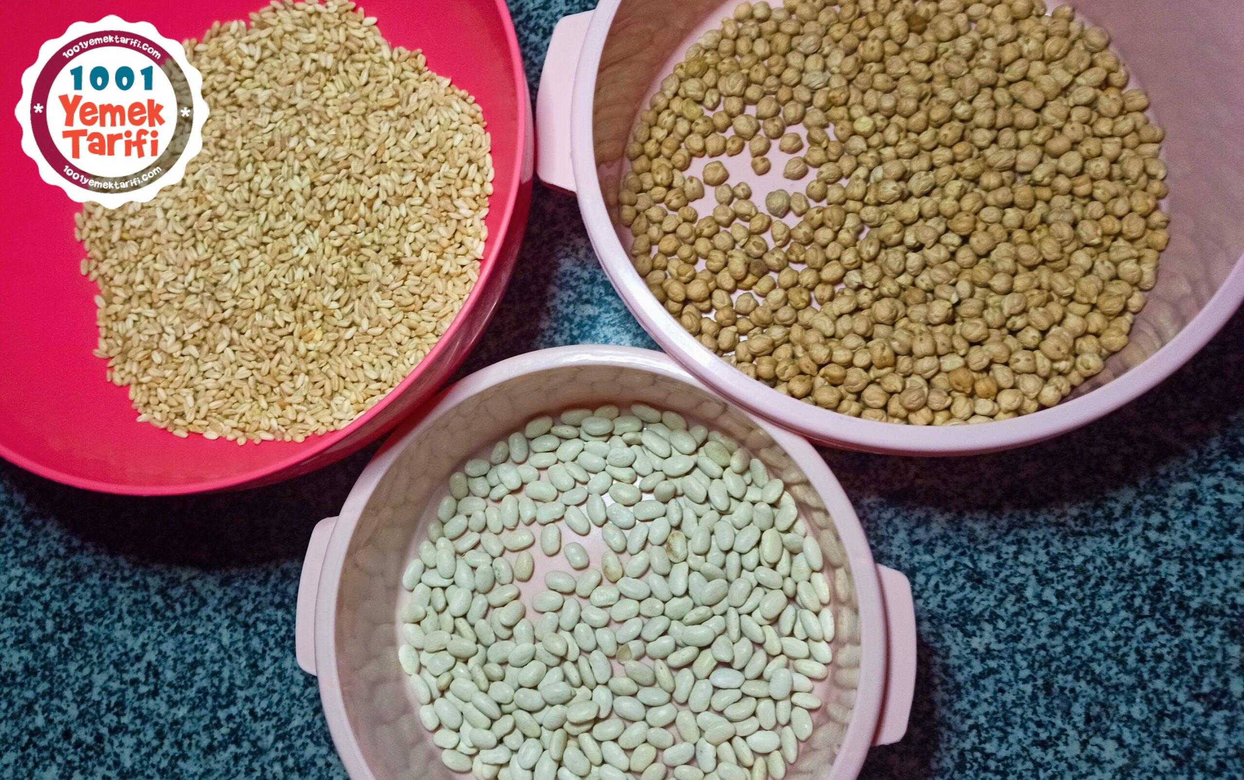 - Bir gece önceden nohut, kuru fasulye ve buğdayımızı ılık su ile ıslatalım. (Hazır haşlanmış bakliyat da kullanabilirsiniz.)