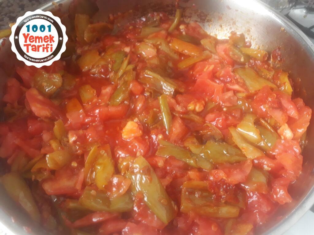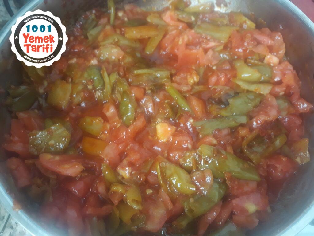 - Kızartılan biberlere salçamizi ekleyip güzelce harmanliyoruz. Daha sonra doğradığımiz domateslerimizi koyup ezilemesini bekliyoruz