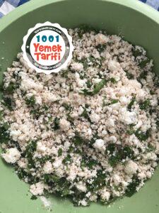 - Hamurumuzdan Ceviz büyüklüğünde parçalar koparıp elimizde açıp içine lor peyniri maydanoz karışımızdan koyuyoruz.