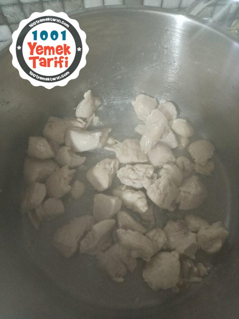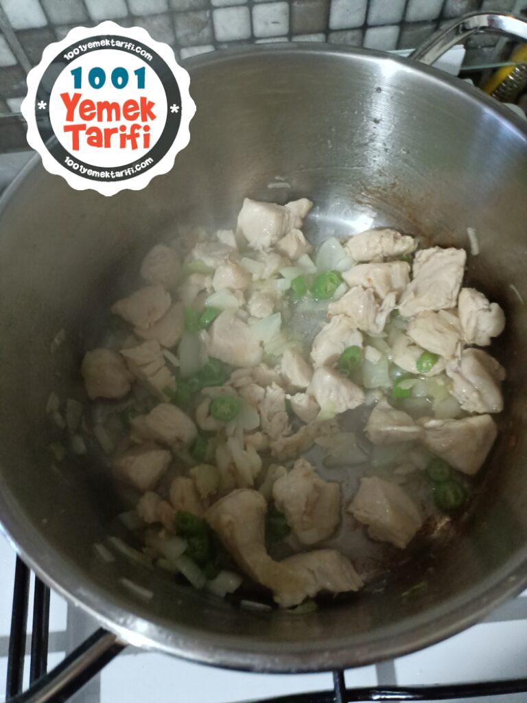 • Tavuğu ısınmış tavaya alalım rengi değişene kadar karıştıralım.