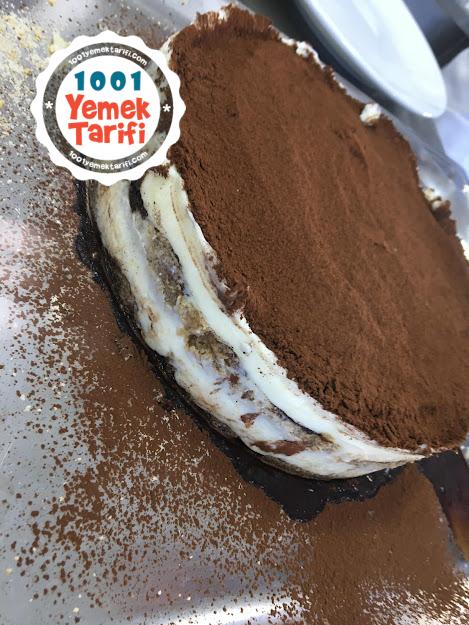 - Üzerine tekrar kreması eklenip küçük bir süzgeç yardımıyla kakao serpilir.