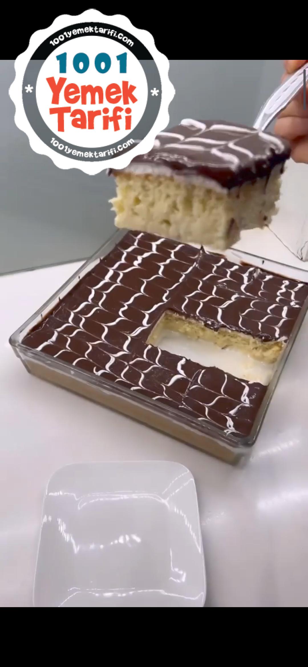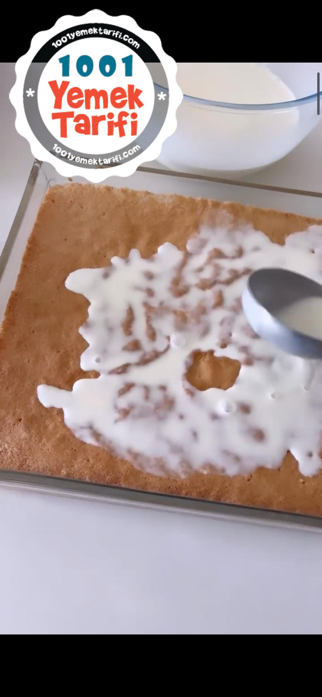• Soğuyan kekimizin üzerine kürdanla delikler açıyoruz ve süt şerbetimizi kepçeyle her alana gelecek şekilde döküyoruz daha sonrasında soğumuş kremsantiden bir kaşık alarak kalan kremsantiyi kekin üzerine spatula yardımıyla ince tabakaya sürüyoruz dolaba atıyoruz