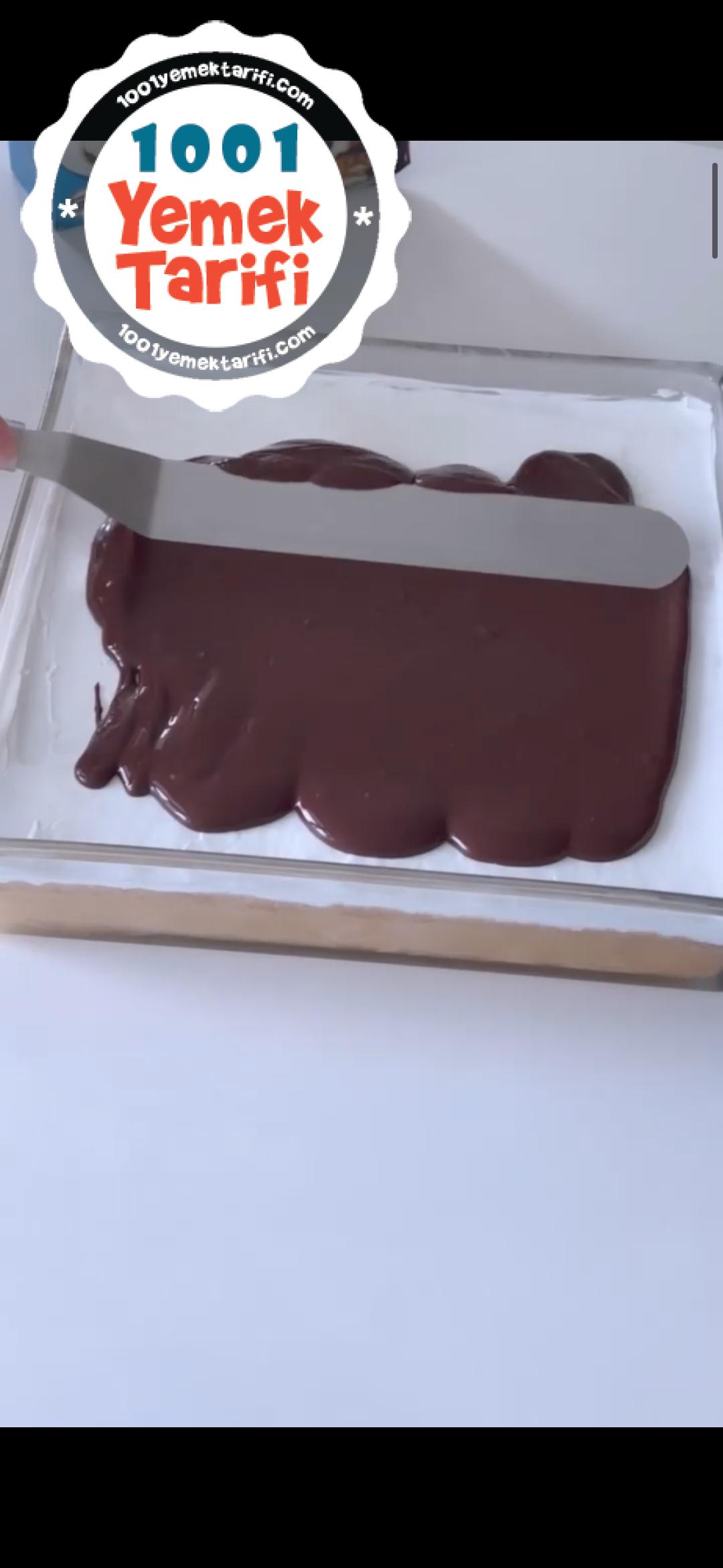 • İyice soğuyan kremsantili kekimizin üzerine çikolata sosumuzu dikkatlice yine bir spatula yardımıyla ince bir tabaka şeklinde sürüyoruz