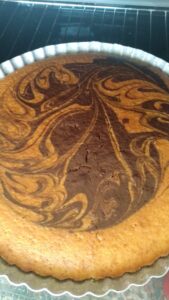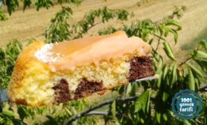 - Dibinde çok az hamur bırakarak yağlanmış unlanmış tart kalıbımıza kek harcımızı dökelim. Bıraktığımız hamurun içine kakaoyu ilave edelim ve iyice karıştıralım.. Kek hamurunun üzerine dökelim bir çatal ile şekil verelim..