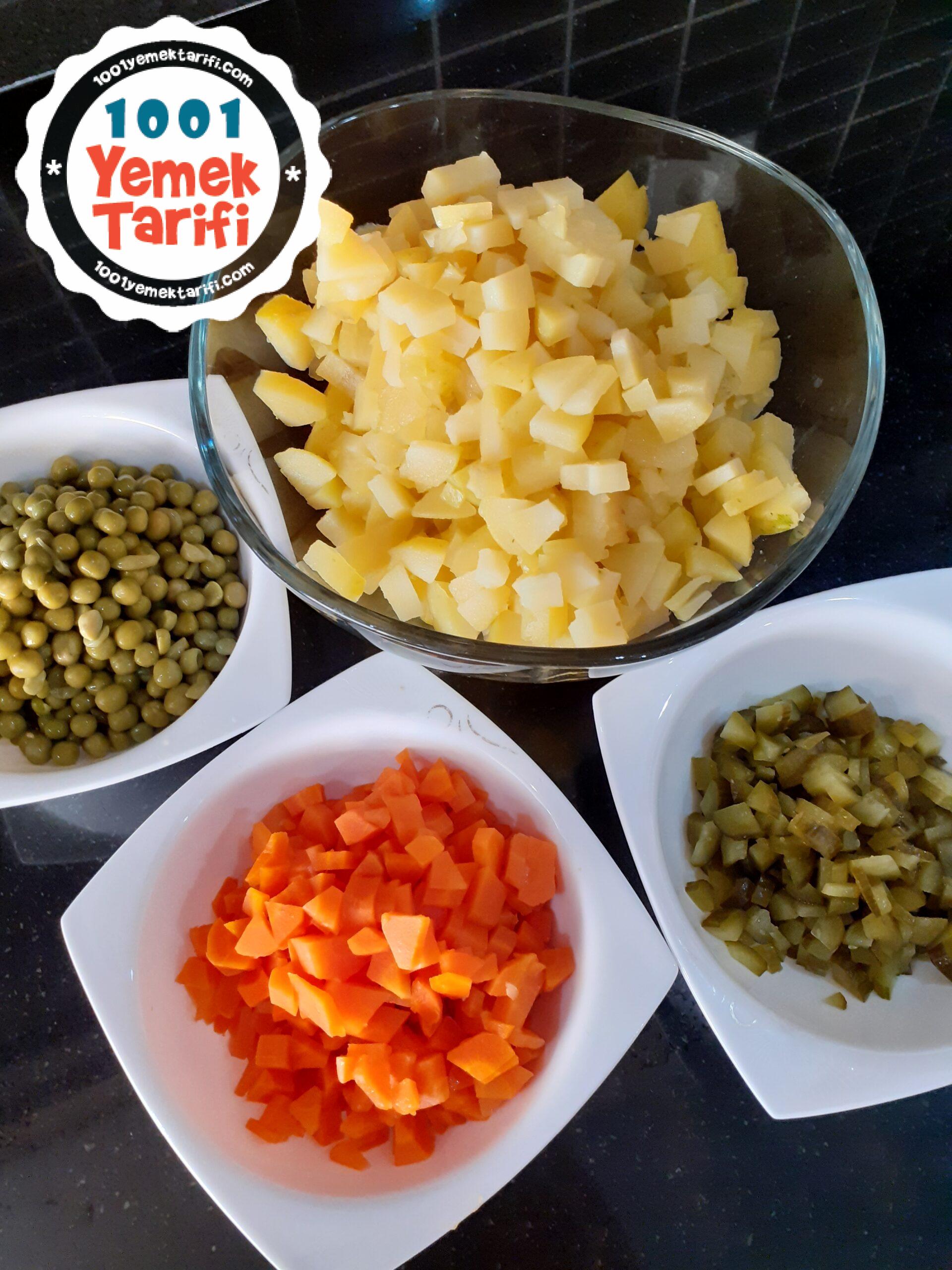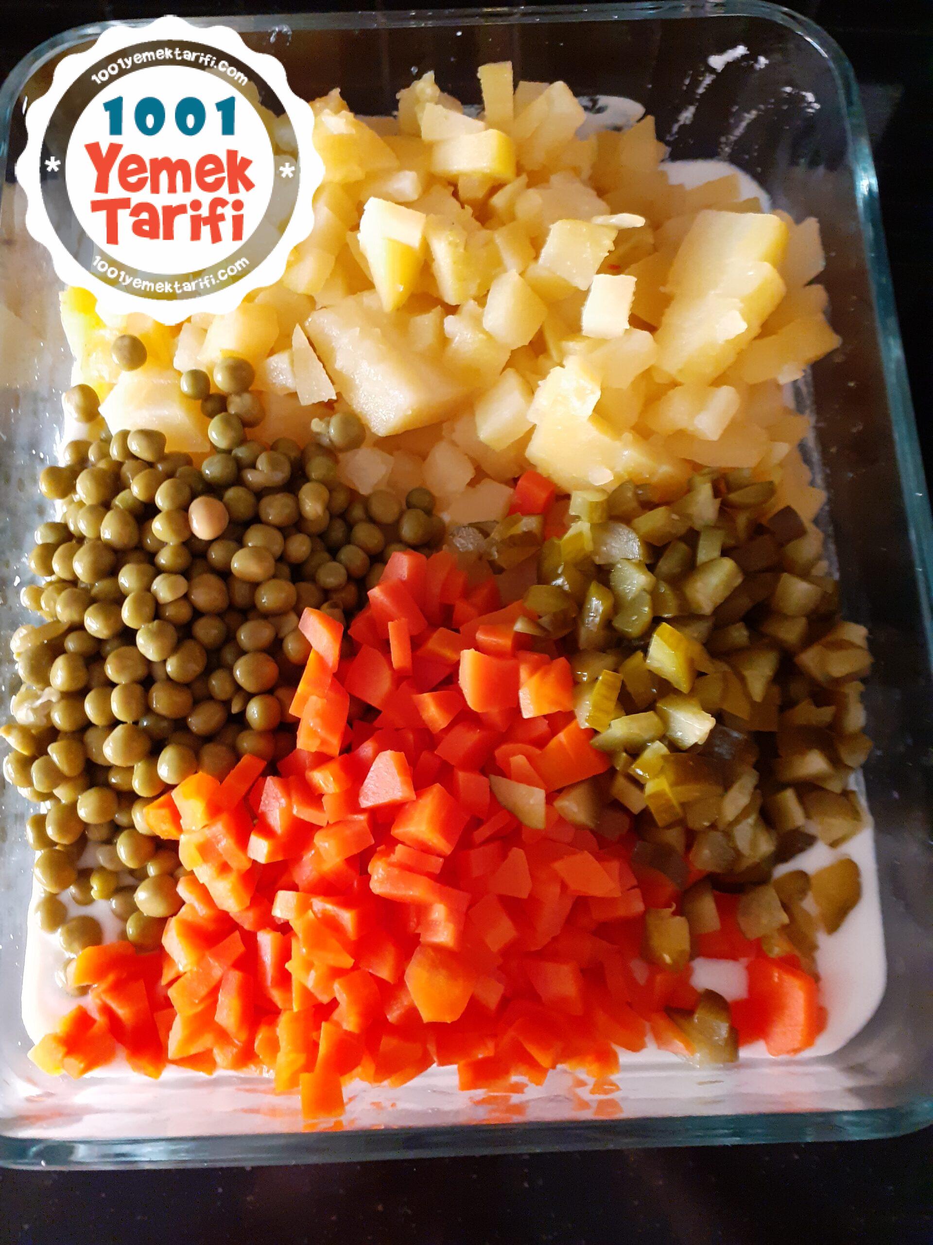 - Daha sonra haşlayıp doğradığımız patates ve havucumuzu ardından küp küp doğradığımız kornişon turşumuzu, bezelyemizi ve tuzumuzu ekleyip karıştırıyoruz.