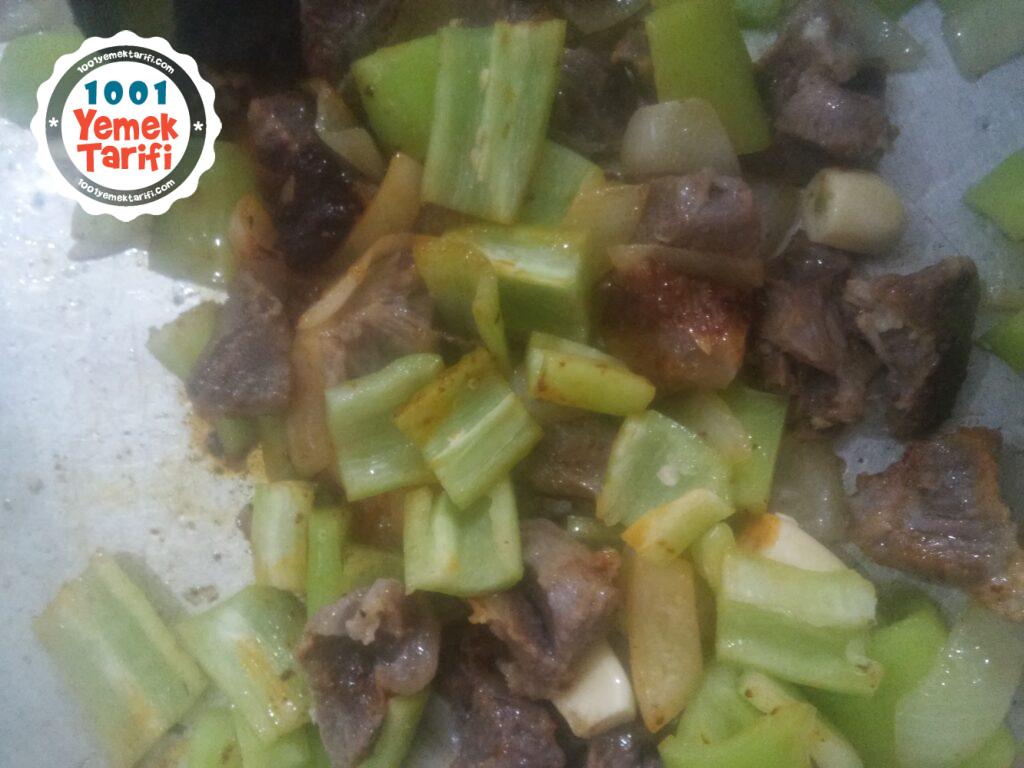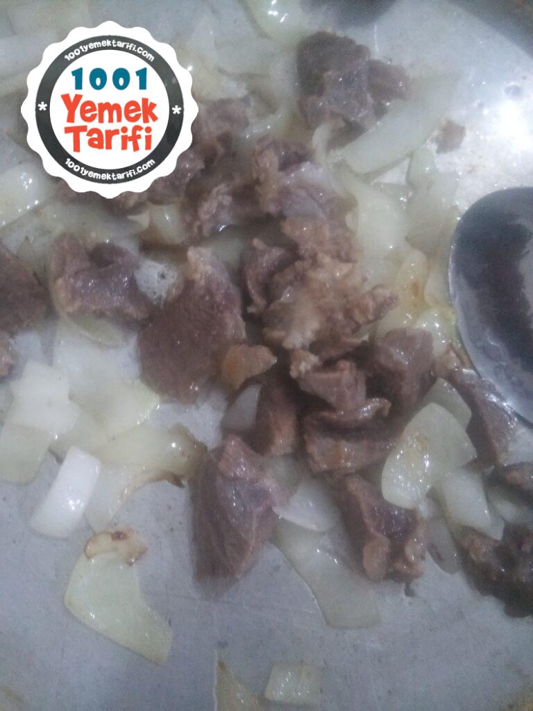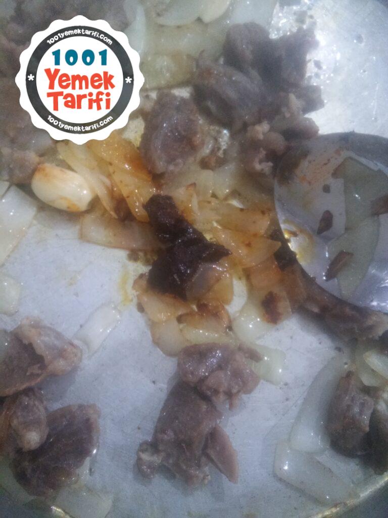 - Rengi dönen soğanların üzerine eti ve sarımsakları ekleyip birkaç dakika beraber sotelenmesini sağlıyoruz.