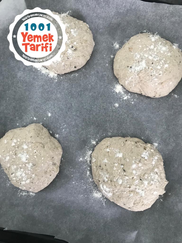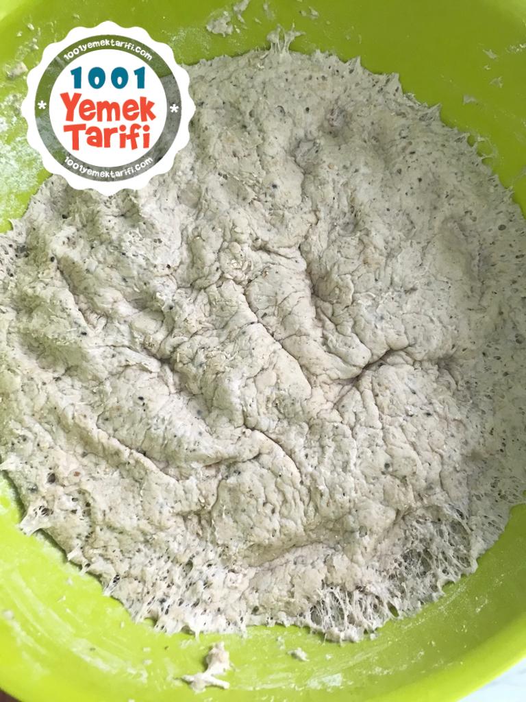 - Çekirdek ve cevizi blenderda un haline getirin. Bütün malzemeleri büyük bir kaba alın ve ortasına bir çukur açın. İçine kuru maya koyacaksanız eğer ılık ve şeker ile beraber kuru mayayı açın ve ortadaki çukara dökün. Yavaş yavaş suyu ekleyin ve iyice yoğurun. Yapış yapış olması lazım hamurun. Yoğurduğunuz hamuru sıkıca kapatın ve 1-2 saat arası bekletin. Havasını indirin ve şekil verin. Şekil verdikten sonra 30-45 dk bekletin. 200 derece fırında hamura ve kalınlığına göre 45-60 dk arası bekletin.