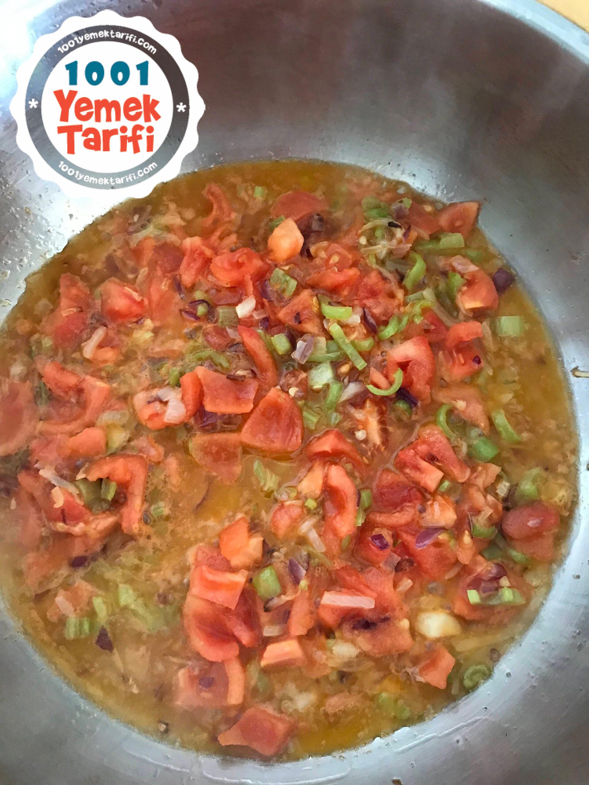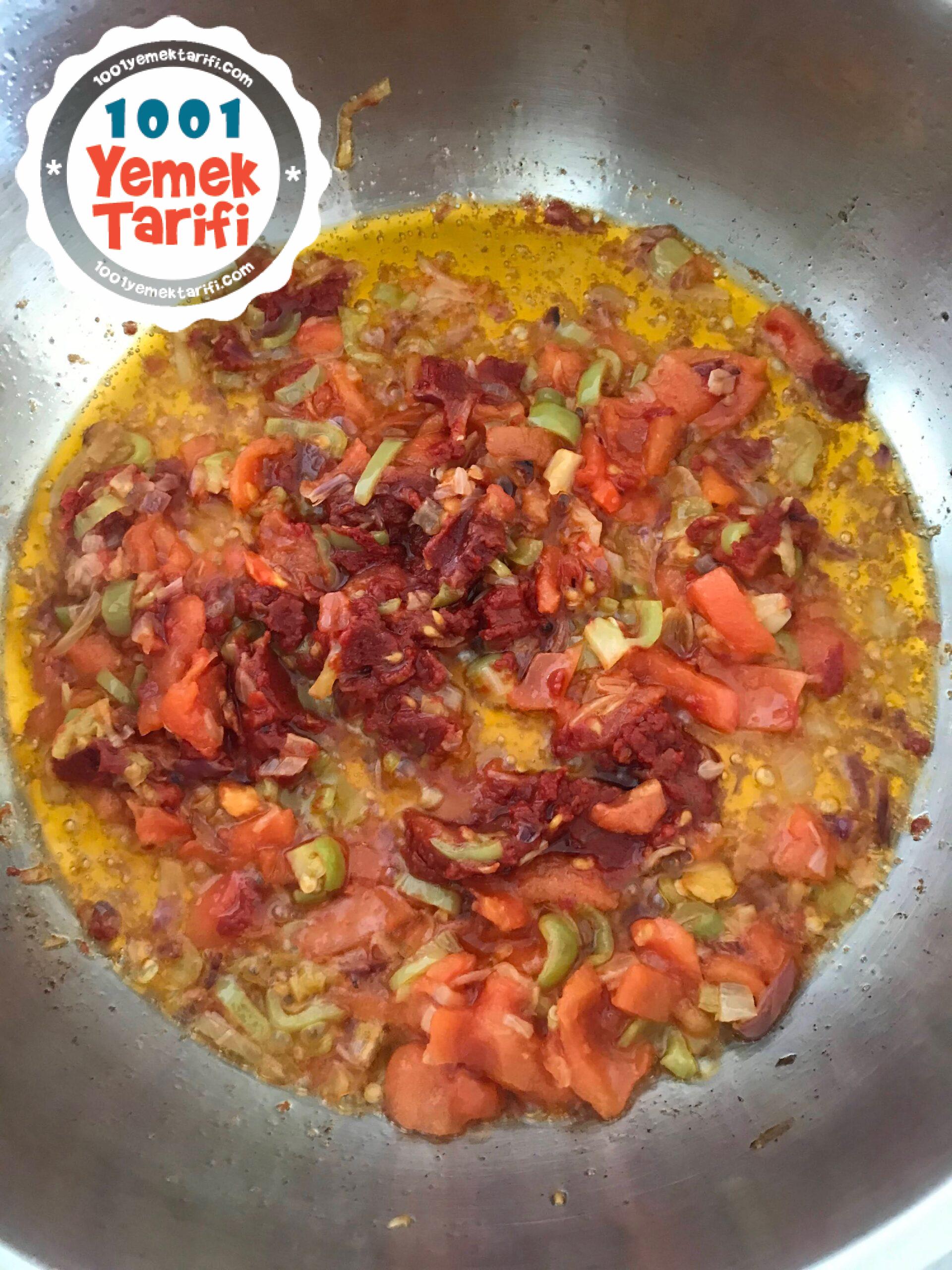 - küp doğranmış domatesleri ekleyip bi kaç tur daha karıştırıyoruz salçayı da ekleyip kavurmaya devam ediyoruz