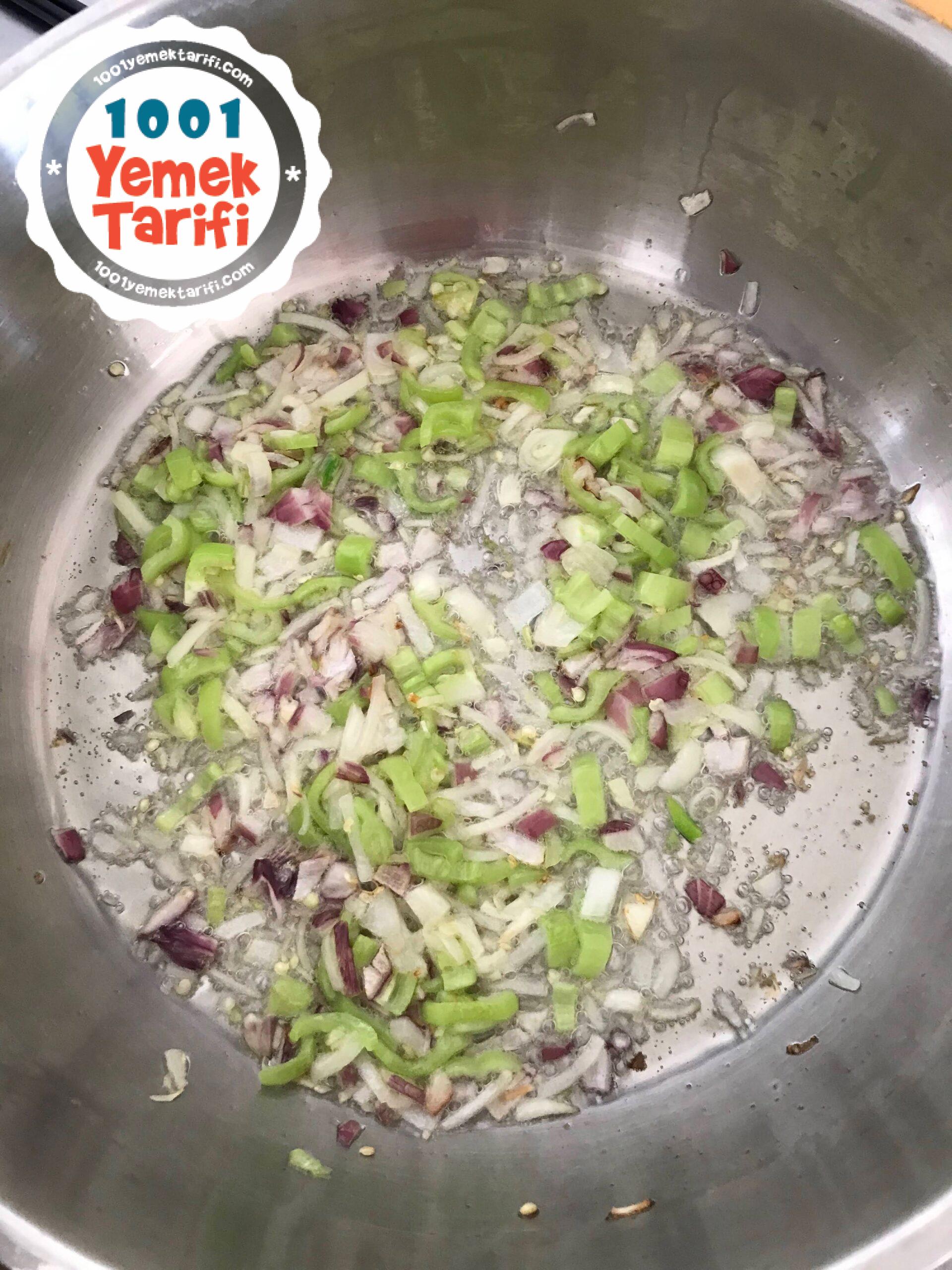 - sonrasında soğan ve biberi yemeklik doğruyoruz tenceremize yeteri kadar yağ alıp soğanları ve biberleri kavuruyoruz