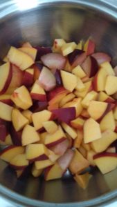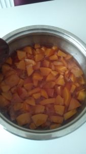 - Derin bir tencereye küçük küçük doğranmış şeftalileri ve eriğimizi koyalım ve üzerine 6,5 su bardağı su ilave edip kaynamaya bırakalım..