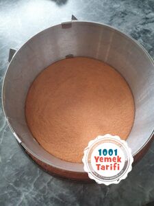 - Soğuyan keki 18 çapındaki kek kalıbına yerleştirelim ve kenarlarını keselim.