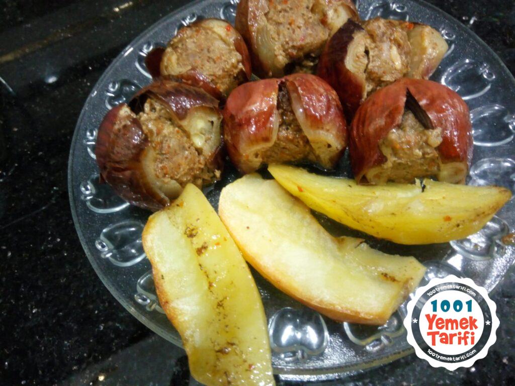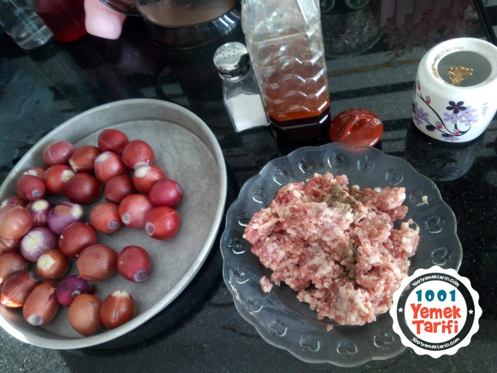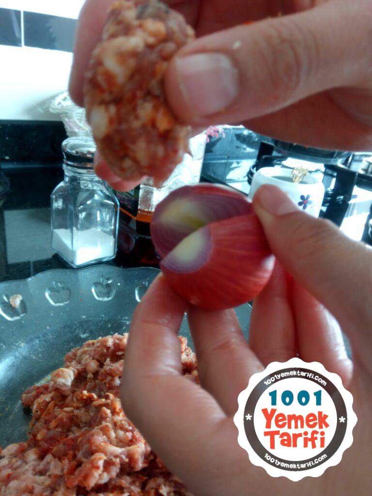 - Başka bir kapta kıyma, Tuz, Karabiber ve pulbiberini koyup harmanlıyoruz. Ceviz büyüklüğünde kıyma alıp yardığımız soğanların arasına yerleştirip kesik kısmı alta gelecek şekilde fırın tepsimize diziyoruz.