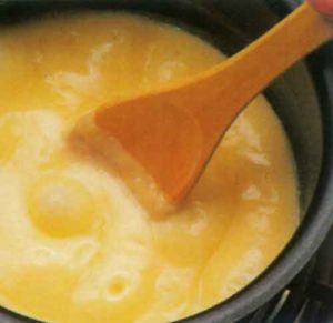 - Sütü kaynatıp toz şeker ve limon kabuğu rendesini ilave edin. Nişasta ile yumurta sarılarını karıştırarak kaynayan sütü bağlayın.