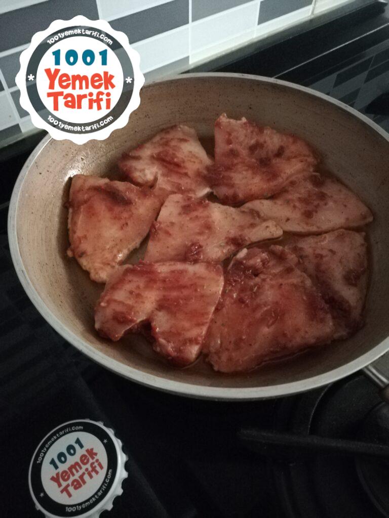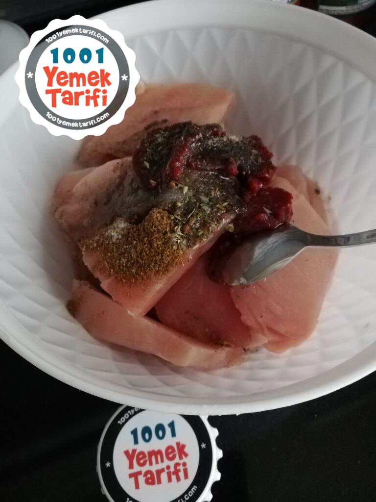 - Derin bir kabın içine tavuk göğsünü ince parçalar halinde keselim