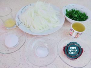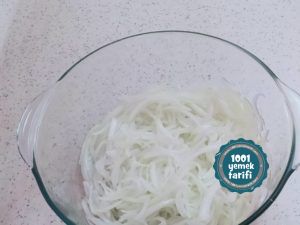 - Öncelikle soğanlarımızı incecik halkalar halinde doğrayalım ve tuzla birkaç dakika soğanları parçalamadan hafif hafif ovalım.