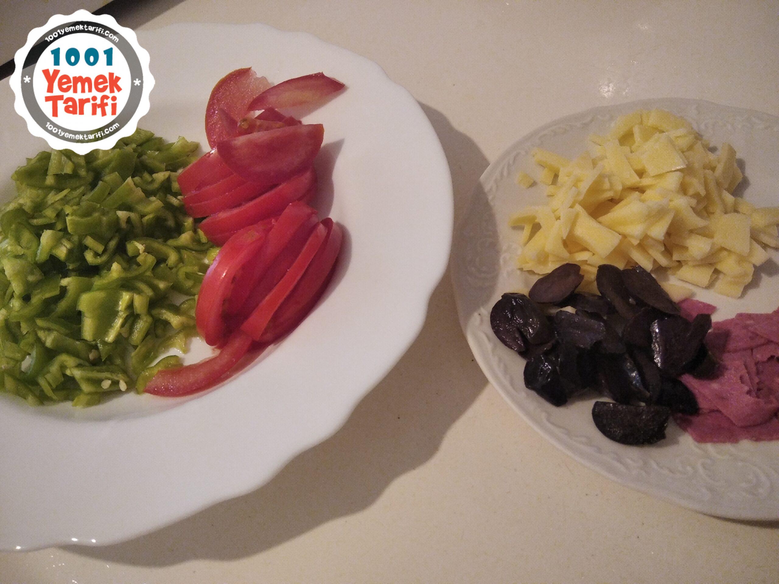 - Doğranmış biber, domates, salam, kaşar peyniri ve zeytin istenildiği gibi doğranır